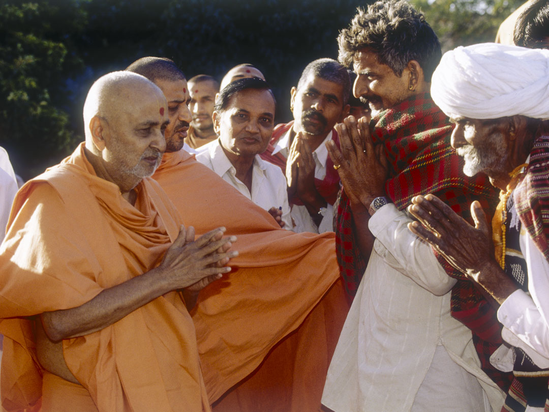 મુલાકાતના અંતે દેવેન્દ્ર જાદવ(સારથિ)નો નાનો શિશુ દિવ્ય સ્વામીશ્રીની નજીક આવ્યો. એક વર્ષના આ શિશુને સૌએ કહ્યું કે ‘નીચો નમીને બાપાને પગે લાગ.’ પણ એ તો બાળપણની રમતમાં હતો, એટલે આજુબાજુ જોઈ રહ્યો હતો. સૌએ ઘણું સમજાવ્યો, પણ એ માન્યો જ નહીં, એટલે સ્વામીશ્રી કહે : ‘અત્યારથી ઊંચો ન રહીશ. ભગવાન અને સંત આગળ ફટ દઈને માથું બરાબર નમાવી દેવું.’ સ્વામીશ્રીએ ગળથૂથીમાં એને સત્સંગના સંસ્કાર પાયા.
