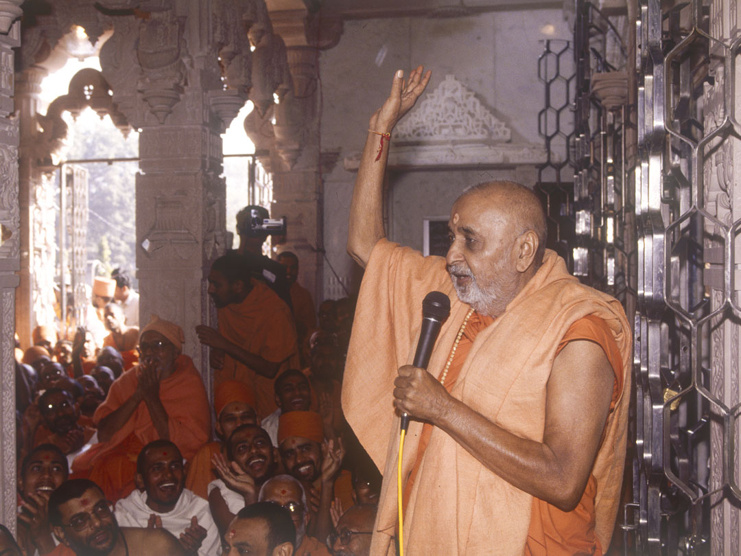 સ્વામીશ્રી પાસે જ્યારે જ્યારે આ બાબતની વિનંતી કરવા માટે વ્યવસ્થાપક સંતો આવ્યા ત્યારે સ્વામીશ્રીનો ઉત્તર એક જ હતો : ‘મહારાજને પ્રાર્થના કરીશું.’ અન્ય એક વખત સ્વામીશ્રીને પ્રાર્થના કરવામાં આવી કે ‘પવન એટલો બધો છે કે પ્લાસ્ટિકની જાળીવાળા મંડપ કર્યા અને લોખંડની પાઇપો કરી, તો એ પાઇપોને પણ ઉખાડીને ફેંકી દે છે, માટે કંઈક દયા કરો.’ ત્યારે પણ સ્વામીશ્રીએ કહ્યું : ‘મહારાજ દયા કરશે, સારું કરશે.’ અને આ નિમિત્તને લઈને સ્વામીશ્રીએ કહ્યું : ‘એક મંડળને ઠાકોરજી સમક્ષ ધૂન કરવા બેસાડજો. જૂનું મંદિર છે ત્યાં સૌ બેસે એમ કરજો.’