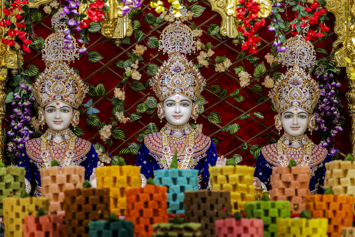 The adornment of the murti of Bhagwan Swaminarayan / Shri Harikrishna Maharaj with sandalwood paste ("chandan na wagha") is an annual feature in Swaminarayan mandirs, during the month of Vaishakh.