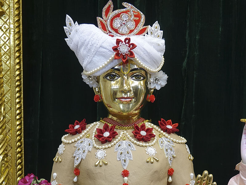 The adornment of the murti of Bhagwan Swaminarayan / Shri Harikrishna Maharaj with sandalwood paste ("chandan na wagha") is an annual feature in Swaminarayan mandirs, during the month of Vaishakh.