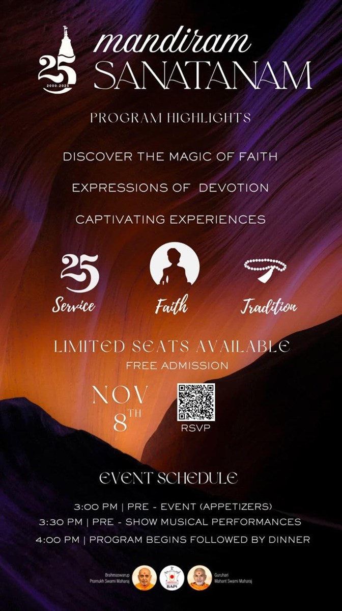 Pramukh Swami Maharaj is an inspiration for countless people around the globe. During the course of his lifetime, he has personally counseled countless people, having read and replied to over half a million letters from individuals of all walks of life. He inspired thousands to lead lives grounded in spiritually and selfless service. The women of BAPS has organized a unique cultural program to celebrate Pramukh Swami Maharaj’s life, legacy, and teachings.
