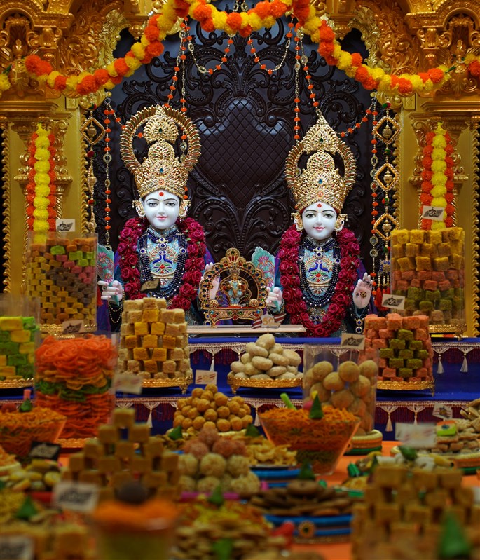 The day following Diwali is the beginning of the Hindu New Year. The Hindu New Year is traditionally celebrated with the Annakut – literally meaning, a mountain of food. Every year thousands of vegetarian delicacies are offered in devotional gratitude for the past year and to seek blessings for the New Year ahead. The Annakut offering includes snacks, sweets, pickles, spicy dishes, salads, fruit drinks and other items devotionally prepared by devotees. We cordially invite you for darshan of the Annakut with family and friends.