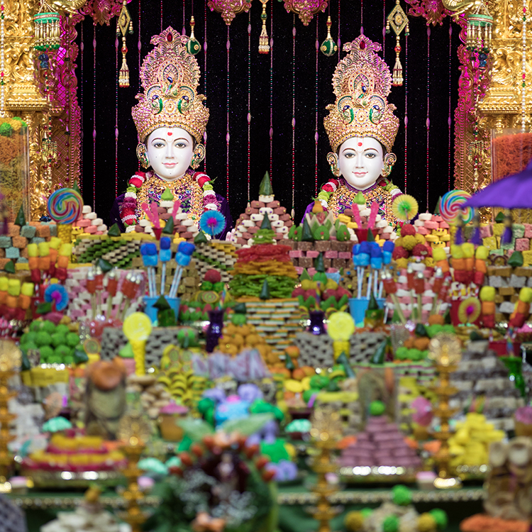 The day following Diwali is the beginning of the Hindu New Year. The Hindu New Year is traditionally celebrated with the Annakut – literally meaning, a mountain of food. Every year thousands of vegetarian delicacies are offered in devotional gratitude for the past year and to seek blessings for the New Year ahead. The Annakut offering includes snacks, sweets, pickles, spicy dishes, salads, fruit drinks and other items devotionally prepared by devotees. We cordially invite you for darshan of the Annakut with family and friends.