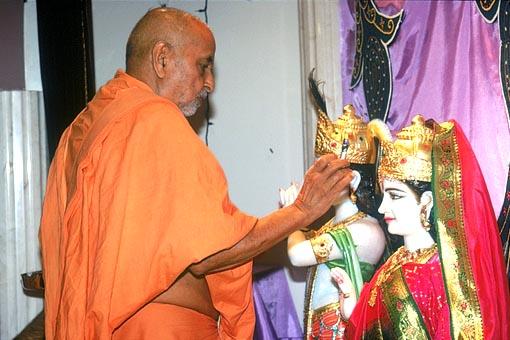 Swamishri performs murti pratishtha of the marble murtis of Akshar Purushottam Maharaj, Radha Krishna Dev, Hanumanji and Ganapatiji and Guru Parampara (canvas) at the Shree Swaminarayan Mandir in Augusta.