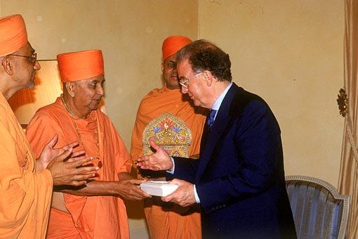 On Friday 16 June 2000, H.E. George Sampaiao, President of the Republic of Portugal, received HDH Pramukh Swami Maharaj at Palacio De Belem in Lisboa, Portugal. His Excellency, who is also at present the President of 'The European Economic Community' flew in specially from Espinho to meet Swamishri. His Excellency felt honored to meet Pramukh Swami Maharaj and was apprised of the socio-cultural and spiritual activities of the organization. The President was very pleased with the fact that Swamiji has inspired thousands to live a drug-free, violence-free, crime-free, honest life charged with the spirit of selfless service, dedication, devotion and discipline.