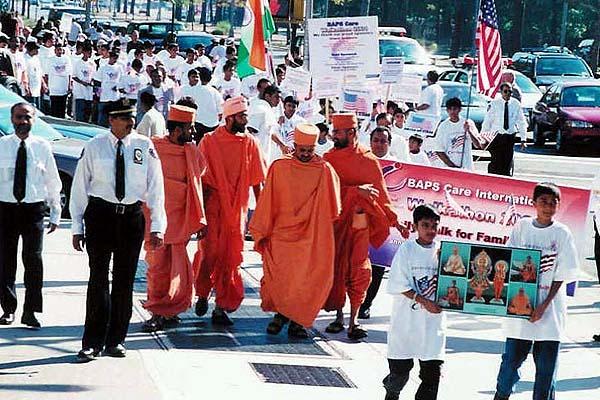 This year’s walkathon is dedicated to the victims of the September 11th tragedy. To best assist the families of the victims, BAPS Swaminarayan Mandir organized a 2.5 miles walkathon on Queens Blvd today. One Thousand Indian American joined the walk and many others participated by sponsoring the walk. All the proceeds of the charity walk are to be donated to the victims of the September 11th tragedy. Under the inspiration of Pujya Pramukh Swami Maharaj, the nation wide walk in 21 centers of BAPS will follow the New York way. The walk was enlightened for the fact that it showed the unity of minds to condemn the act of terrorism in the world. With patriotic music blasting through the streets of New York the walk was a grand success, helped by the New York’s finest. The noteworthy help extended by the police officers of Pct. 112 was appreciated.