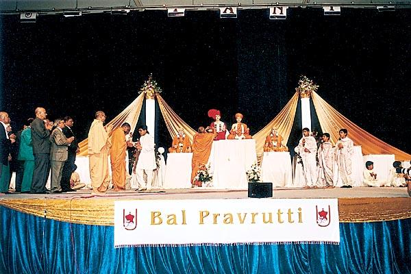 On Sunday 1 June 2003 the Bal Mandal of UK launched their Golden Jubilee Celebrations 'Bal Pravrutti Suvarna Jayanti'. Over 3000 devotees attended this unique launch, which was compered and conducted by members of the Bal Mandal. The program included chanting of the shantipaath, the singing of kirtans and a grand finale featuring a dance "Aje suvarna mahotsav aj…" It was an extraordinary sight to see three-year-old Neal narrating a story to a gathering of 3000 devotees and twelve-year-old Sandeep confidently delivering a speech on the moral values that this organisation has nurtured in children living in Western society. The highlight was a grand procession in which both adults and children placed a kumbh (a symbol of eternity) before the murtis to launch various projects marking the start of the golden jubilee celebrations.