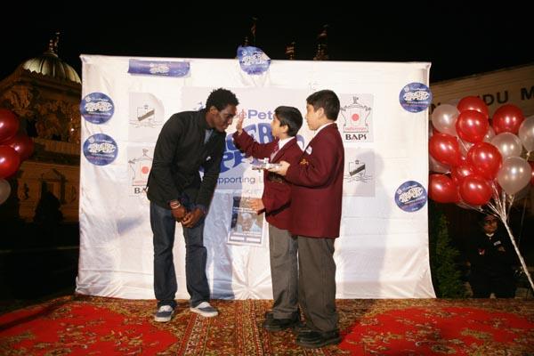 Andy spoke to the crowd, who had gathered for the launch outside in the Mandir courtyard area. He expressed his delight at coming to the Mandir and seeing hundreds of children who had gathered with shoes for the appeal. The inauguration was marked with a countdown and release of confetti before hundreds of pairs of shoes were brought onto the stage for the appeal, much to Andy’s delight. The Children’s Forum has set a target of 5000 pairs of shoes for the appeal. Parents and children contributed to the launch in a strong message of support.