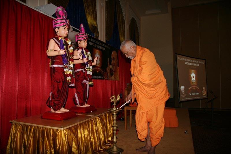 With the express wishes of Pramukh Swami Maharaj in 2004, annual student conventions (vidyarthi shibirs) have been organised to provide students with the skills, confidence and support to succeed academically through a foundation rooted in spiritual principles. Thus, over 130 kishores and kishoris from across the UK arrived on the evening of Friday 25 September 2009 for the annual Vidyarthi Shibir, in the presence of Pujya Doctor Swami.
