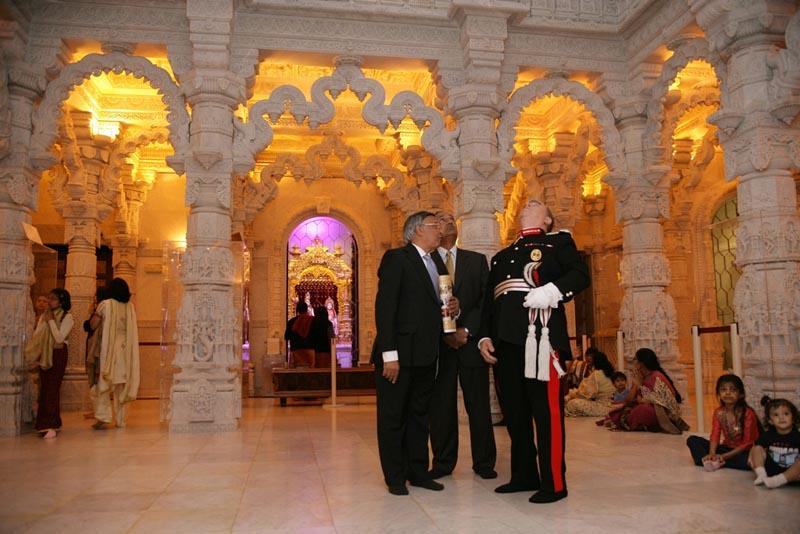 The Lord-Lieutenant and his wife were received at the Mandir by the Worshipful Mayor of Brent, Cllr Jim O’Sullivan. After being warmly welcomed by young boys and girls of the BAPS Children’s Forum, all distinguished guests were escorted to a special exhibition conveying the academic, recreational, environmental and social activities undertaken by the Forum. Another section highlighted its community work in aid of charities such as Children in Need, The Anthony Nolan Trust, and Blue Peter’s Shoebiz Appeal.