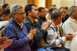 Devotees and well-wishers gathered in the Haveli Prayer Hall for the Chopda Pujan ceremony, which commenced at 6.00pm. Hundreds of new account books – in a variety of paper and electronic forms – were blessed through the showering of flowers petals and rice grains amid the chanting of Vedic hymns and prayers. In the short assembly which followed, Yogvivek Swami read out Pramukh Swami Maharaj’s Diwali message and blessings before photos were shown from Mumbai, India, where Pramukh Swami Maharaj had celebrated Diwali a few hours earlier.