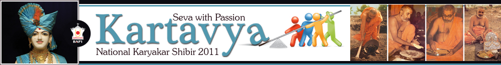 The shibir began with a short sketch depicting how Swamishri has been fulfilling his personal 'kartavya' (duty). The opening video instilled the message for the attendees of their own kartavya. Anandswarup Swami then inaugurated the shibir with the traditional deep pragatya before the aims and objectives of the three-day event were outlined by Yogvivek Swami.