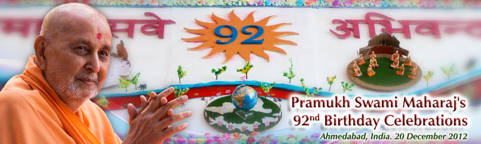 The 92nd birth anniversary of His Holiness Pramukh Swami Maharaj was celebrated with great devotion in Ahmedabad, India, on Thursday December 20, 2012. The special festival began with devotees gathering for darshan of the Arti early in the morning. The Mandir and sinhasans were colorfully decorated. The Mandir compund contained a large cake, 22 feet long and 8 feet wide, emphasizing four aspects of Swamishri’s life - 17,000 villages and towns that he has visited during his tireless Vicharan; the 750,000 letters he has personally written to devotees and well-wishers and anyone else who writes to him for blessings; the 17,500 centers he has set up for satsang; 900 sadhus who currently serve Bhagwan Swaminarayan under his leadership; and the 1,100 mandirs of BAPS Swaminarayan Sanstha which help maintain satsang and values, continuing Bhagwan Swaminarayan’s legacy.