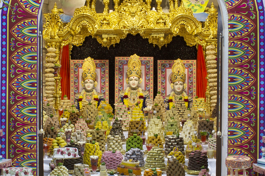 In keeping with tradition for this day, a beautiful Annakut – literally, ‘mountain of food’ – was artistically arranged before the murtis in the upper sanctum and also in the Haveli assembly hall. It is an offering made in thanksgiving to God for his providence over the year past and the year to come. The hundreds of varieties of pure vegetarian food is the largest such devotional offering in Europe.