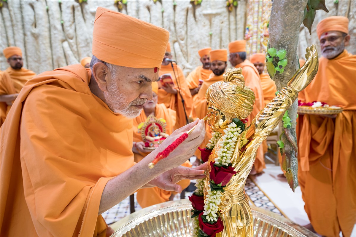 The abhishek mandapam was specially designed to depict the incident from Bhagwan Swaminarayan’s childhood and feature a murti of Ghanshyam climbing a pipal tree. Pujya Ishwarcharandas Swami performed the vedic rituals. The ceremony was conducted by Pujya Bhadreshdas Swami and Pujya Aksharvatsaldas Swami. Thereafter, Mahant Swami Maharaj offered the first abhishek to Ghanshyam Maharaj with the waters of 108 holy rivers from India.