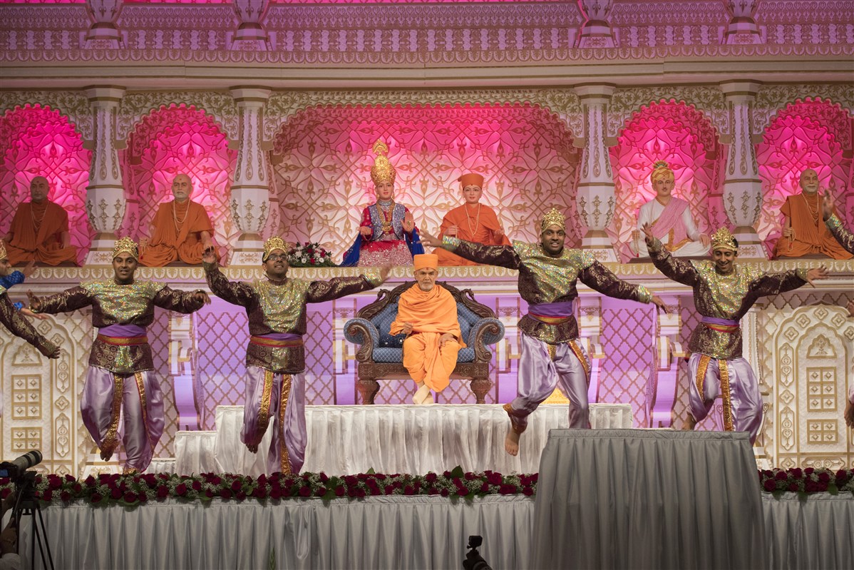 The evening programme centred around Swamishri’s stuti ‘Shobhe saumya mukharvind hasatu…’, exploring his serenity and divine grace, and reflected upon his humble nature and attachment to God – virtues which won the hearts of Yogiji Maharaj and Pramukh Swami Maharaj.