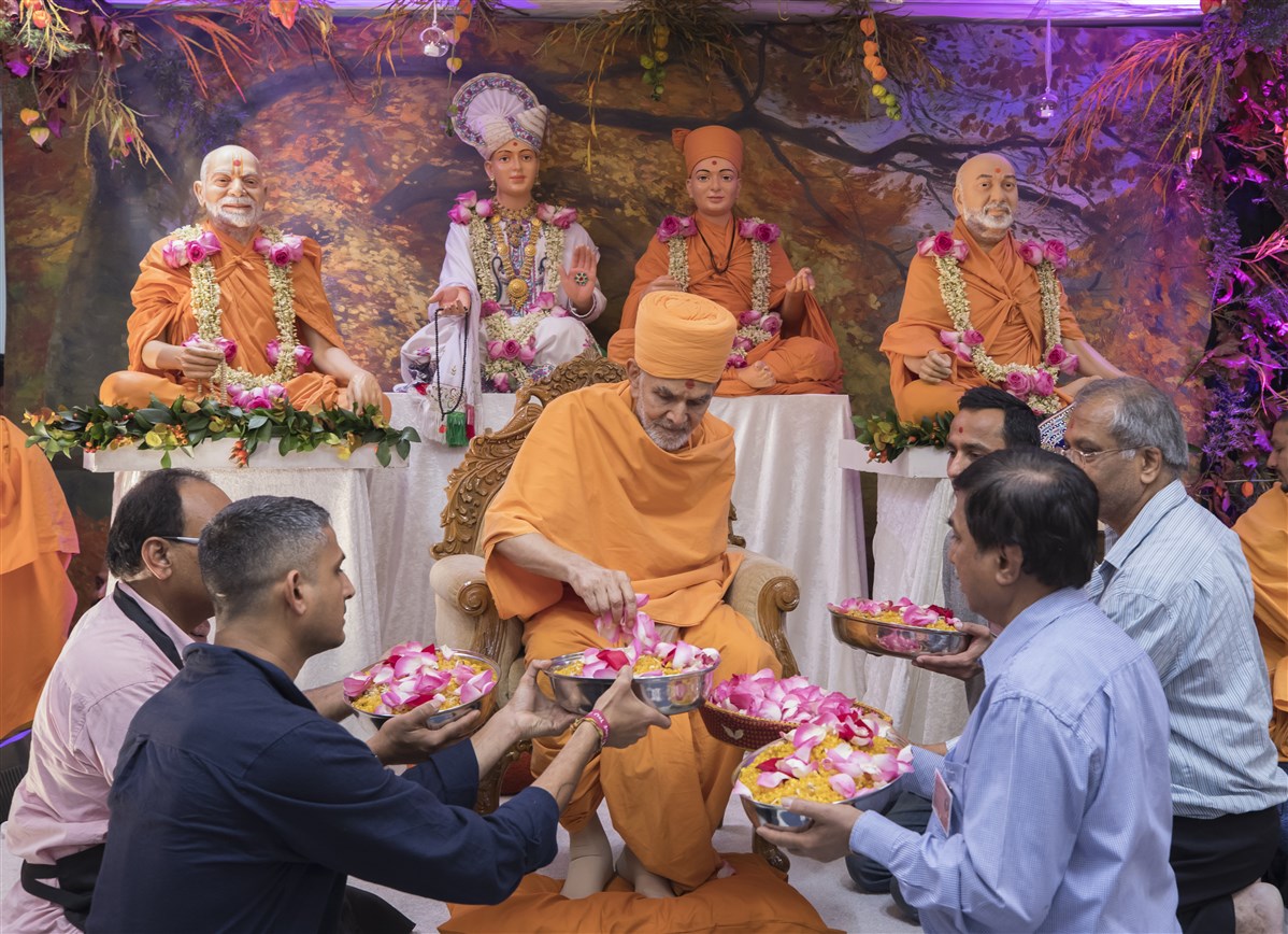 Swamishri wrote a concluding message of ‘samp, suhradbhav and ekta’ which was shared with the congregation. He also sanctified food items to be served as prasad to the devotees.