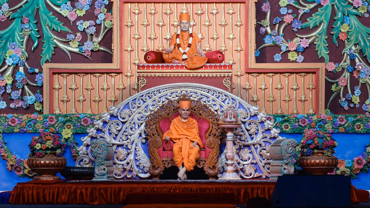 An evening program was organized to celebrate Mahant Swami Maharaj’s life and work, yet he insisted that the greatness of Pramukh Swami Maharaj remain the focus of the program.