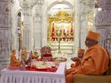 Mahant Swami Maharaj watched the swamis perform the mahapuja from Surat in Gujarat, India, and also gave his blessings for the New Year, for peace, harmony and righteous prosperity to prevail around the world.