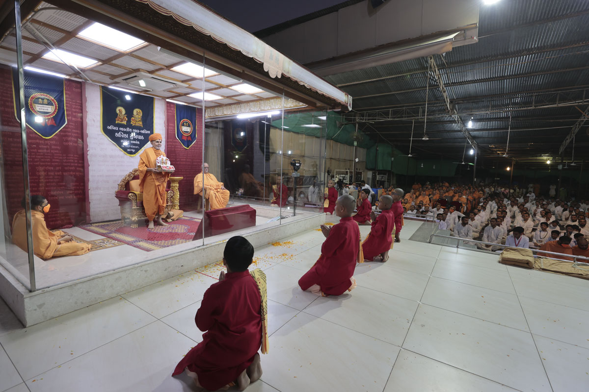 To appreciate their efforts, a special felicitation assembly was held for all the balaks, balikas and their parents in Sarangpur in the presence of Param Pujya Mahant Swami Maharaj on 13 October 2021.