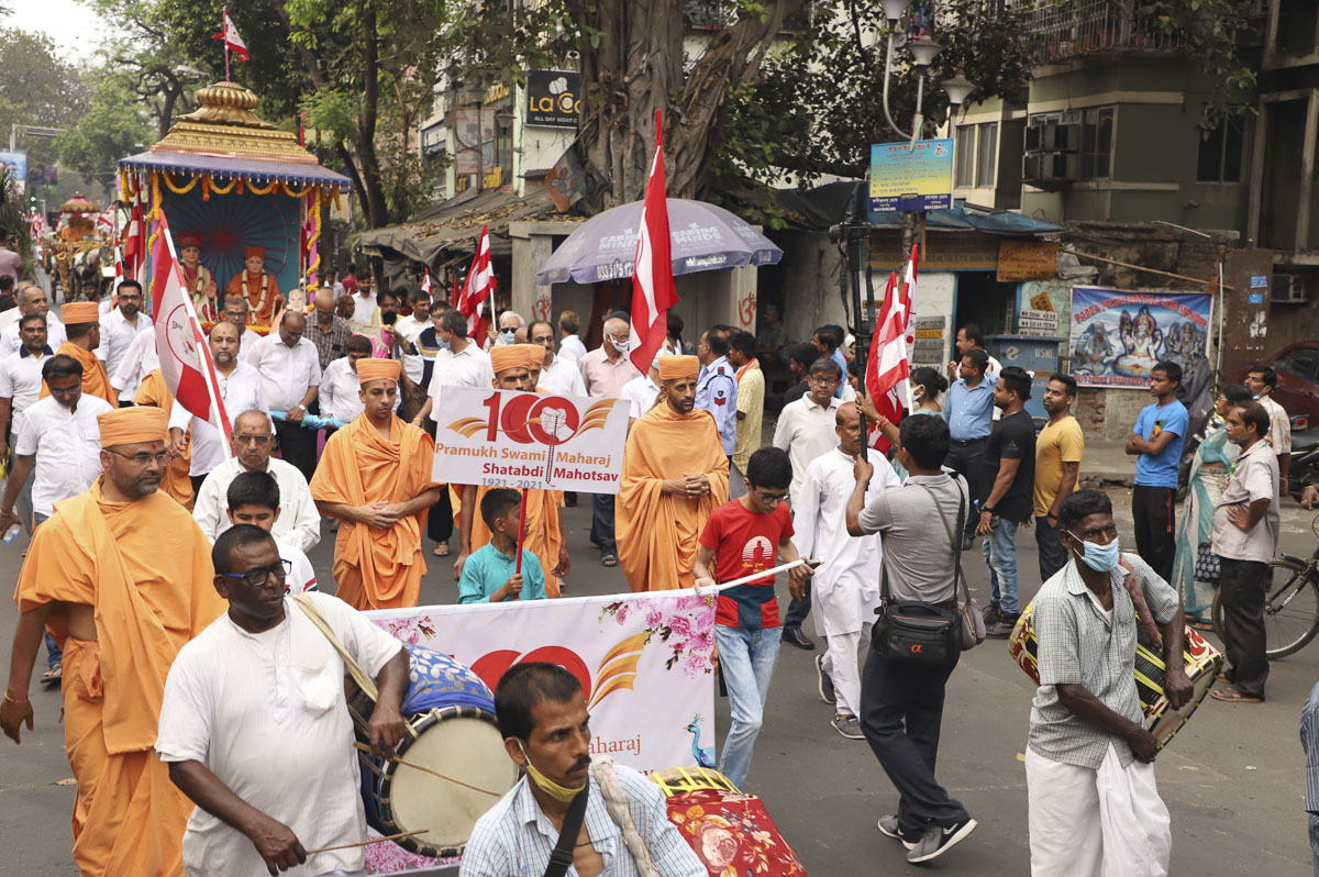 Under the auspices of the Pramukh Swami Maharaj’s birth centenary celebrations, around 500 devotees participated in the colorful procession through the streets of Bhowanipore. The procession began from and concluded at the BAPS Swaminarayan Mandir at Chakraberia. Its main elements included: