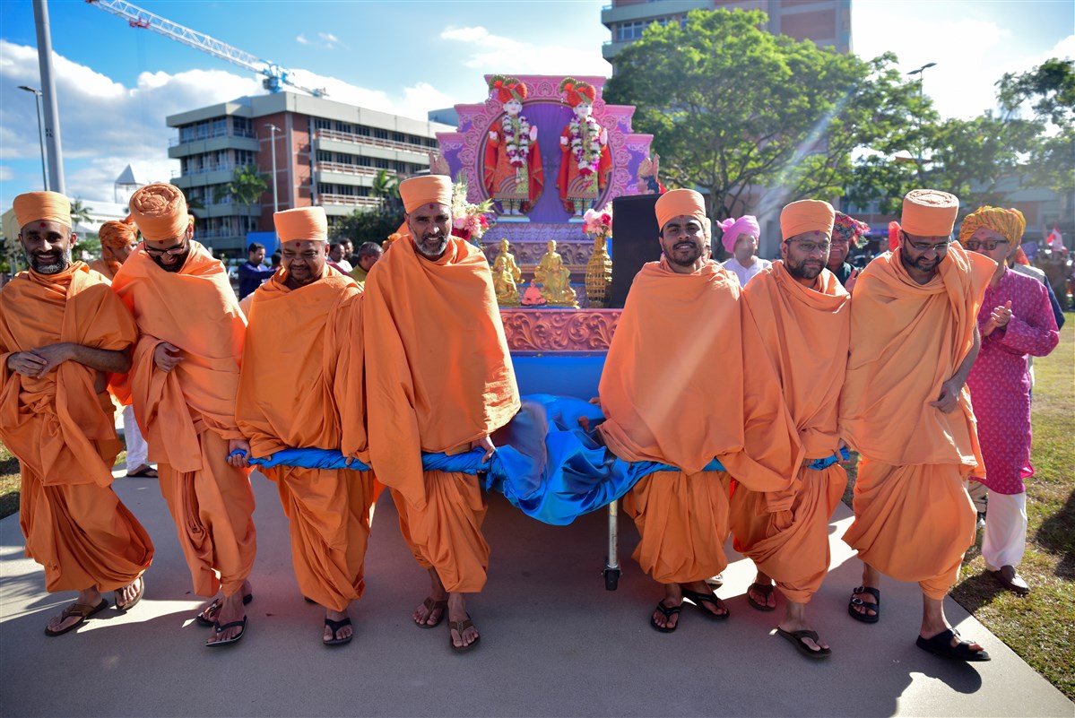 On 30 September, around 300 devotees participated in the grand procession of Akshar-Purushottam Maharaj and other murtis on beautifully decorated chariots along a 1.5 km route through Cairns Esplanade. Local residents and passers-by welcomed the procession with great joy and interest. Also present on this occasion were Mr Destry Puia, Director of Lifestyle & Community, Cairns Regional Council, and his team.