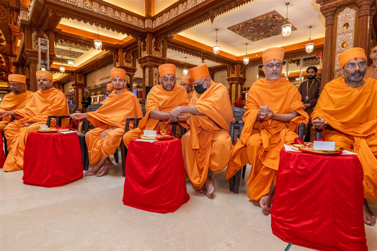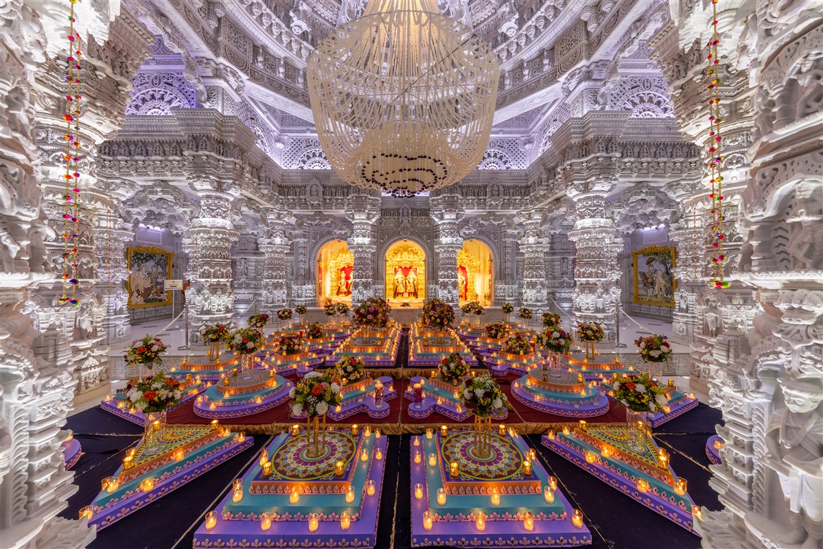 In 2014, at the age of 92, Pramukh Swami Maharaj traveled to Robbinsville, NJ to inaugurate the BAPS Shri Swaminarayan Mandir, Robbinsville, NJ and perform a special ceremony for the upcoming Swaminarayan Akshardham. Visitors read a life-size display with a history of the Swaminarayan Akshardham in Robbinsville.