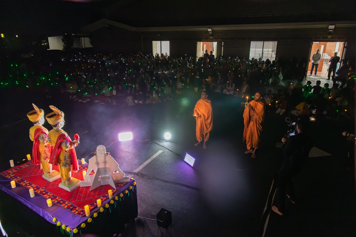 The celebrations began with the Akshar Purushottam Maharaj Vadhamna, where devotees gathered to welcome the new murtis of Shri Akshar Purushottam Maharaj into the Mandir with heartfelt prayers. As part of this event, many devotees also had the chance to welcome Akshar Purushottam Maharaj into their homes.