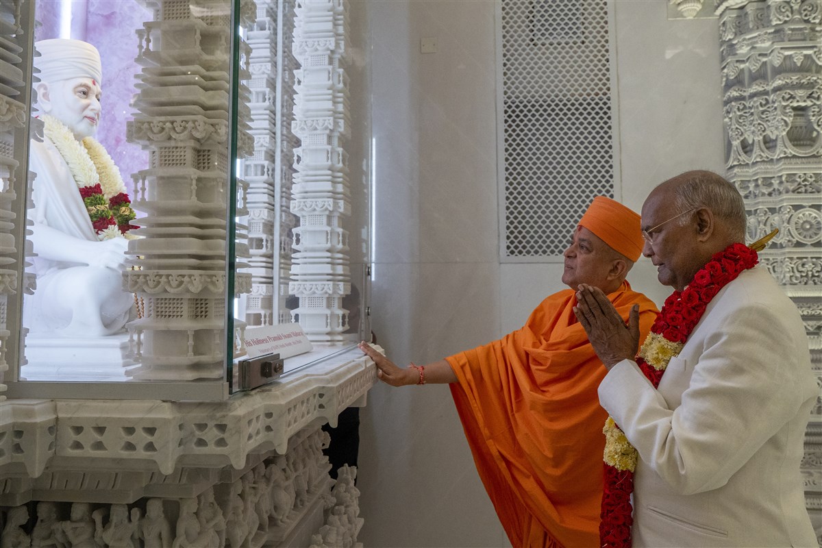 Thereafter, Shri Ram Nath Kovind was welcomed by Swami Brahmaviharidas on the mandir plinth and guided under the Harmony Dome. Inside the mandir, Shri Kovindji admired the intricacy of the Pillar of the Pillars, offered heartfelt prayers at each of the seven inner shrines, and reflected on the far-reaching legacy of His Holiness Pramukh Swami Maharaj, whose vision brought this spiritual haven to life.