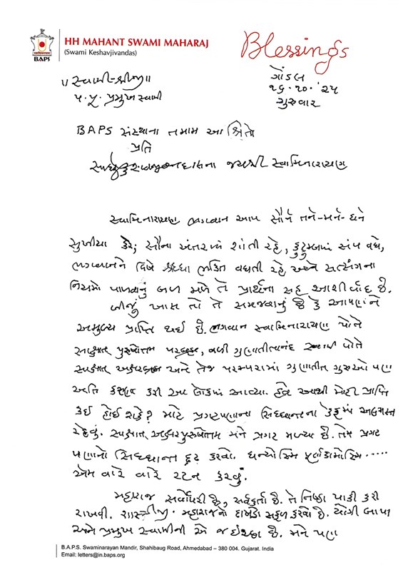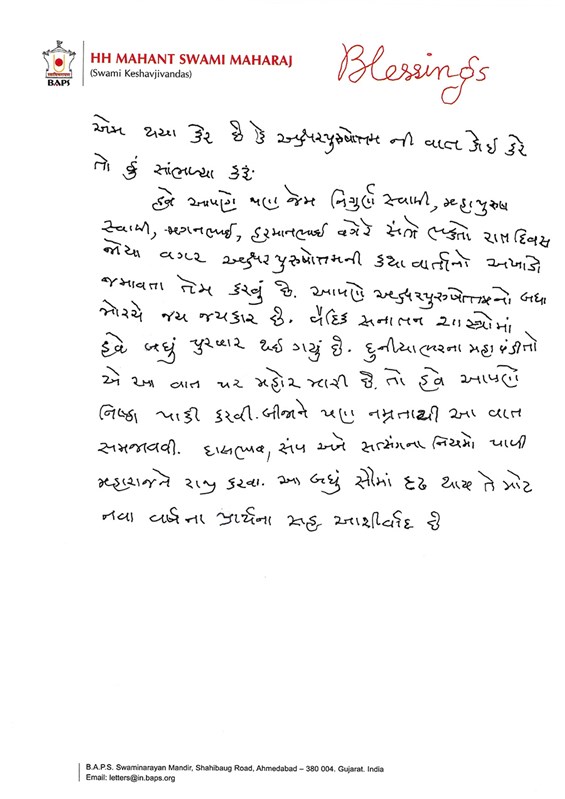 Our prayerful blessings that Bhagwan Swaminarayan may keep you all happy in body, mind and means; that you all may keep peace in your hearts; that unity increases in your family; faith and devotion towards Bhagwan grow; and that the strength to follow the commandments of Satsang is obtained.
