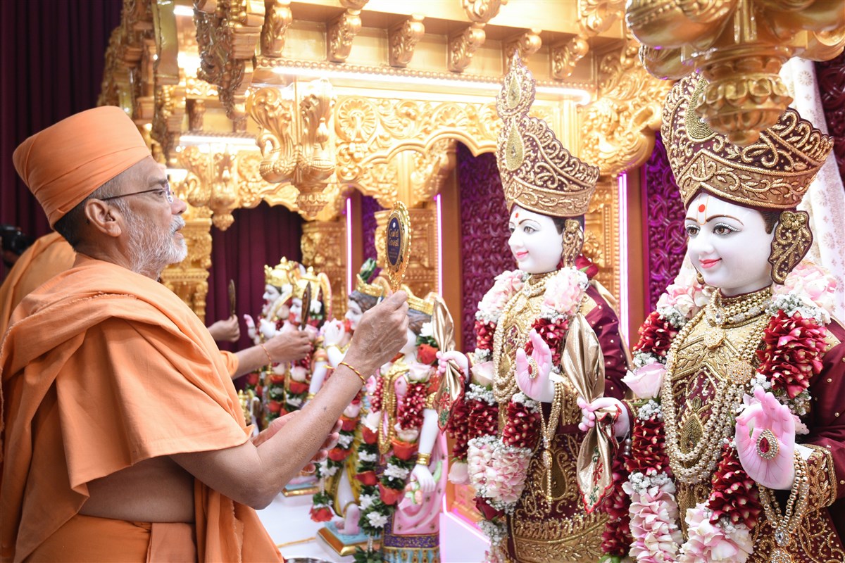 On the morning of 28 September, devotees witnessed the sacred murti-pratishtha rituals and thereafter attended the celebration assembly. Previously, on 26 Feb 2025 in Melbourne, Mahant Swami Maharaj had performed the Vedic pratishtha rituals of the murtis.