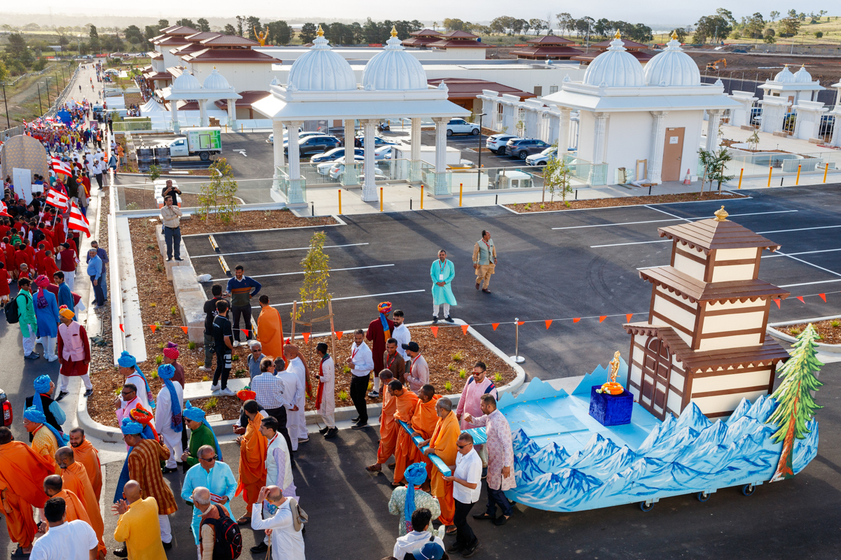 On 7 March, a colorful nagar yatra (grand procession) took place around the cultural precinct campus. The sacred murtis to be installed in the mandir were honored on beautifully decorated floats. Mark Speakman, Leader of the NSW Opposition; Mark Coure, NSW Shadow Minister for Multiculturalism; and Jordan Lane, Shadow Assistant Minister for Multiculturalism were present to take part in this joyous procession.