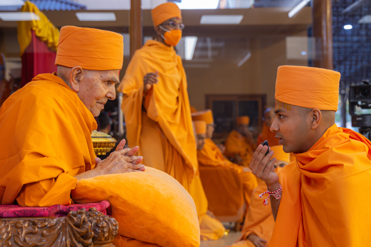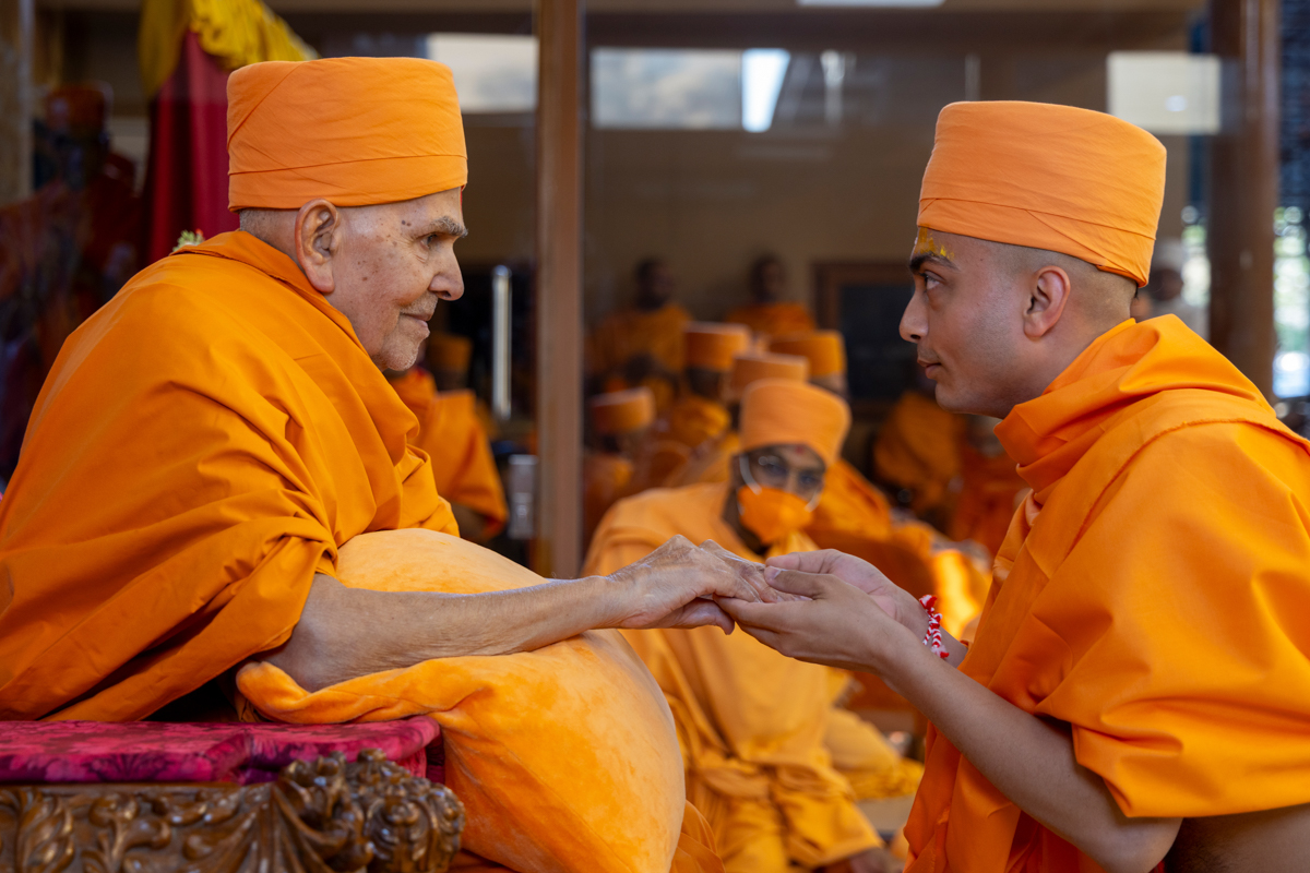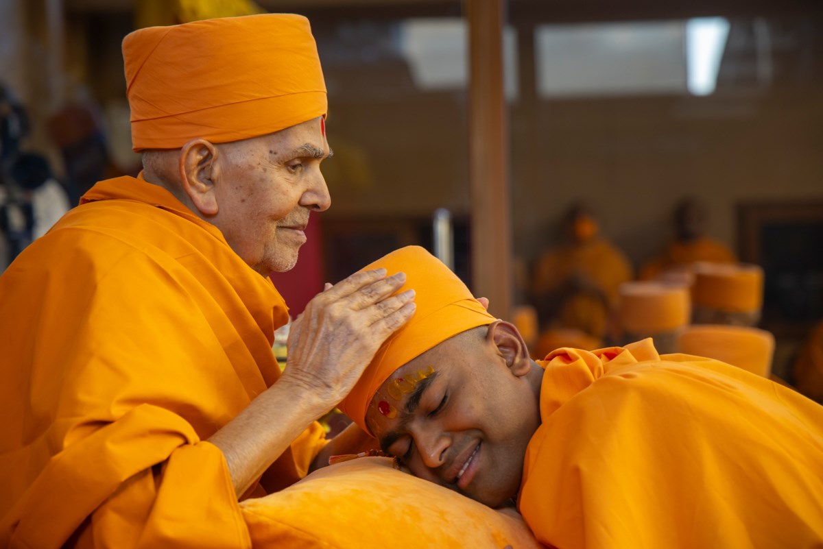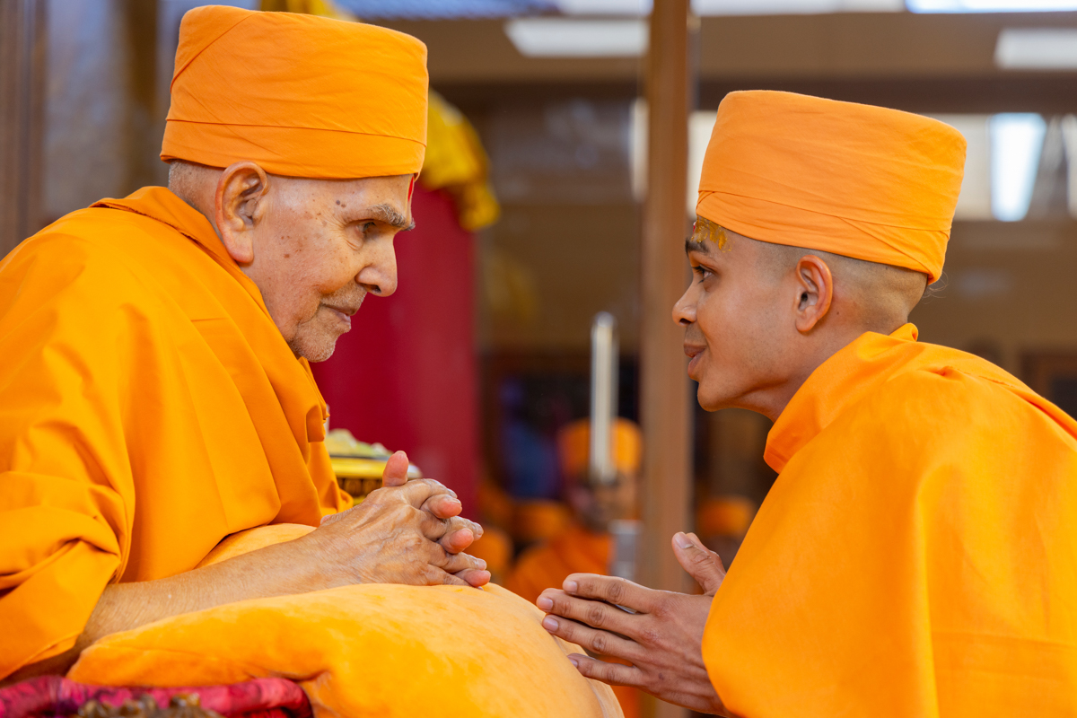 Swamishri gives the diksha mantra and blessings to a newly initiated swami