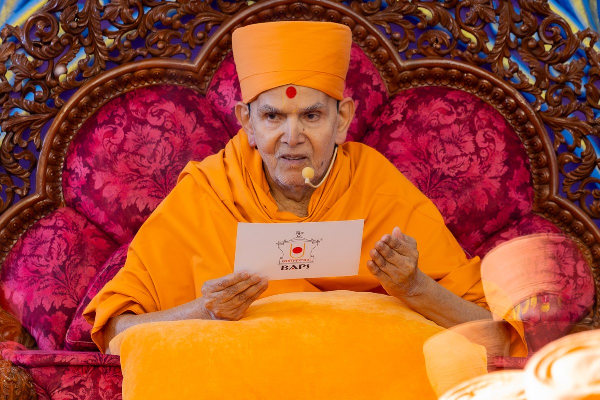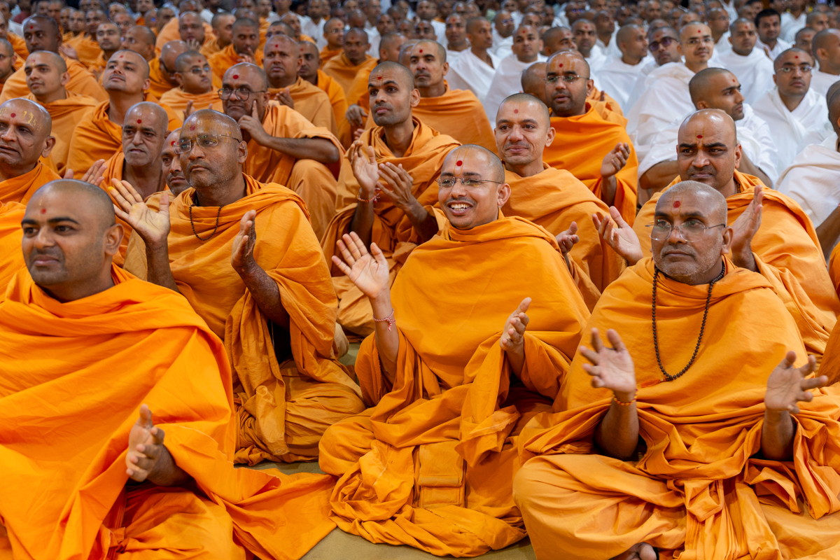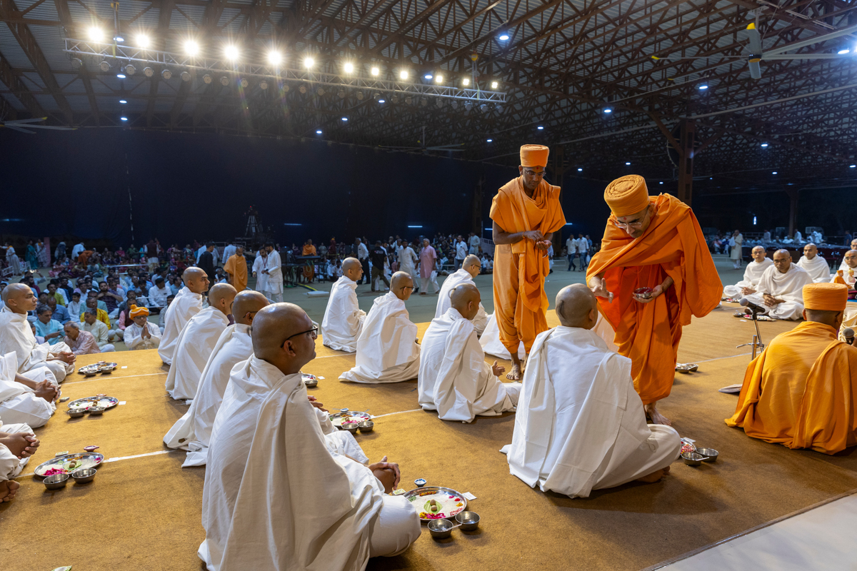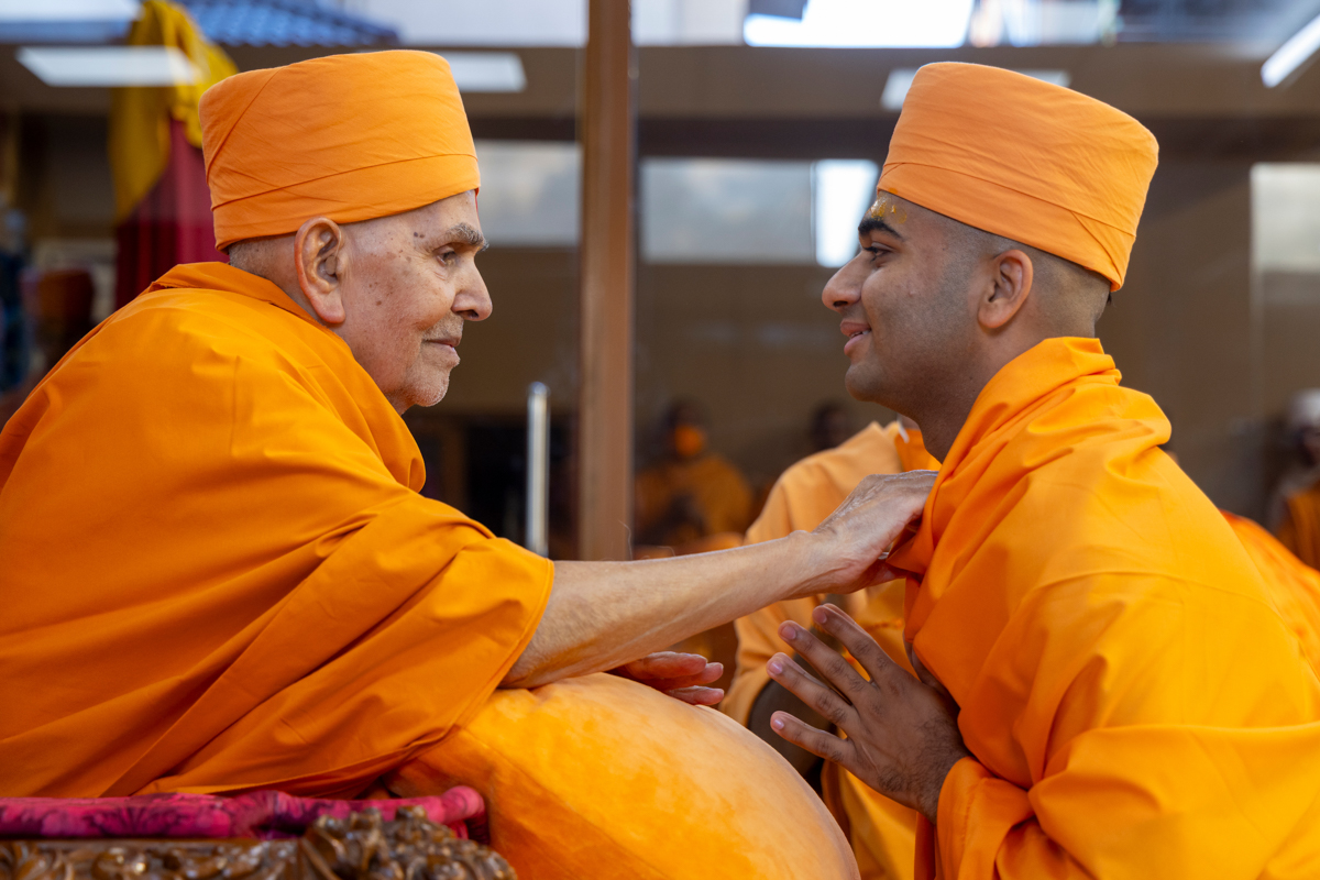 Swamishri gives the diksha mantra and blessings to a newly initiated swami
