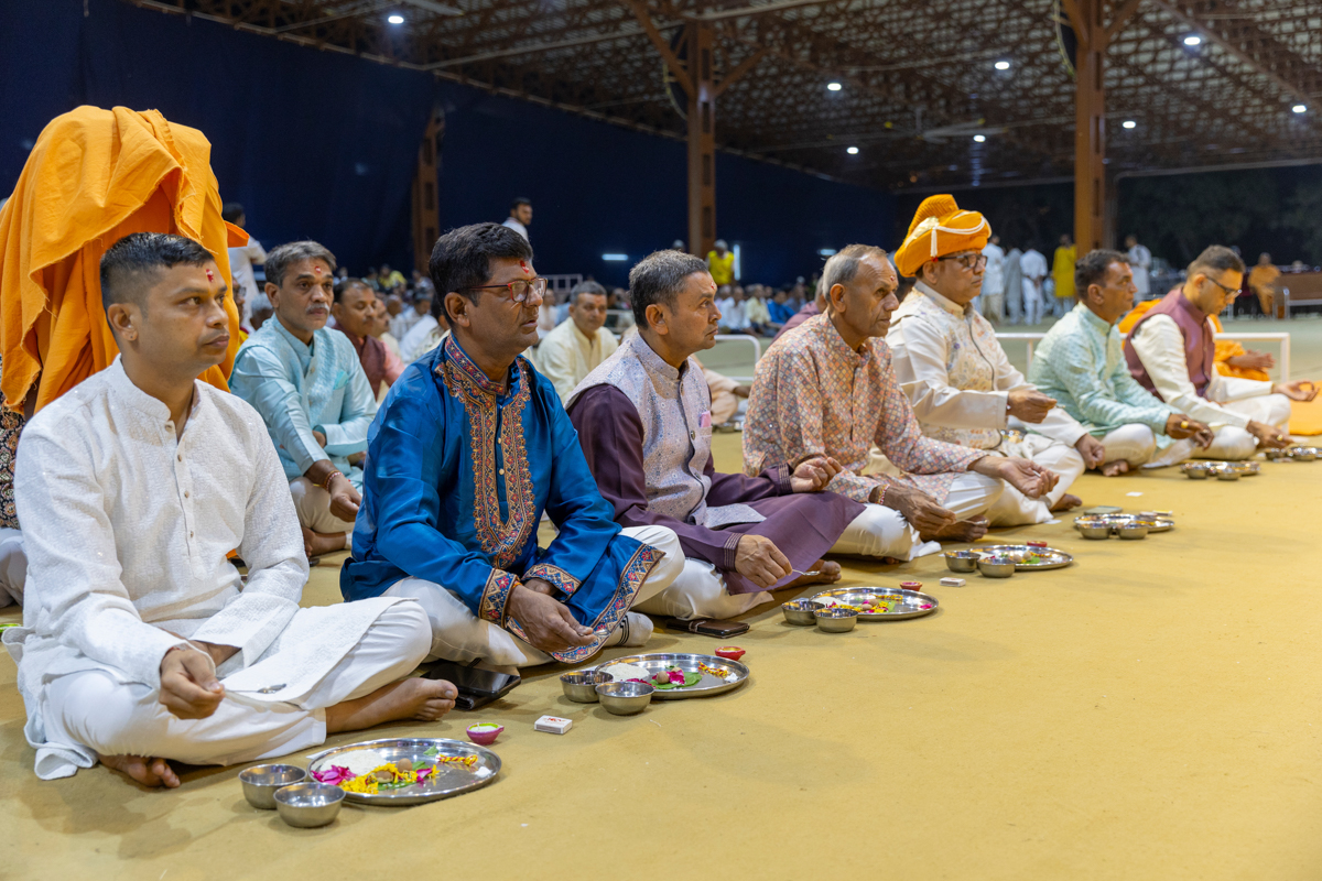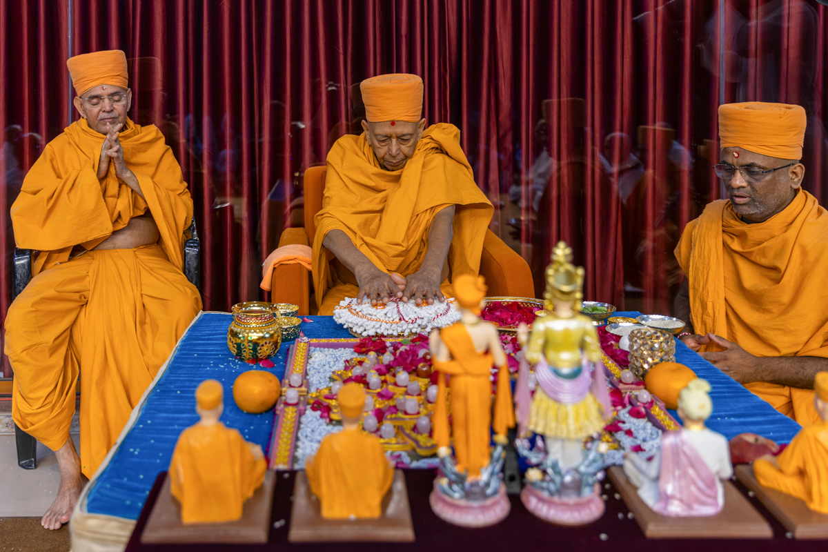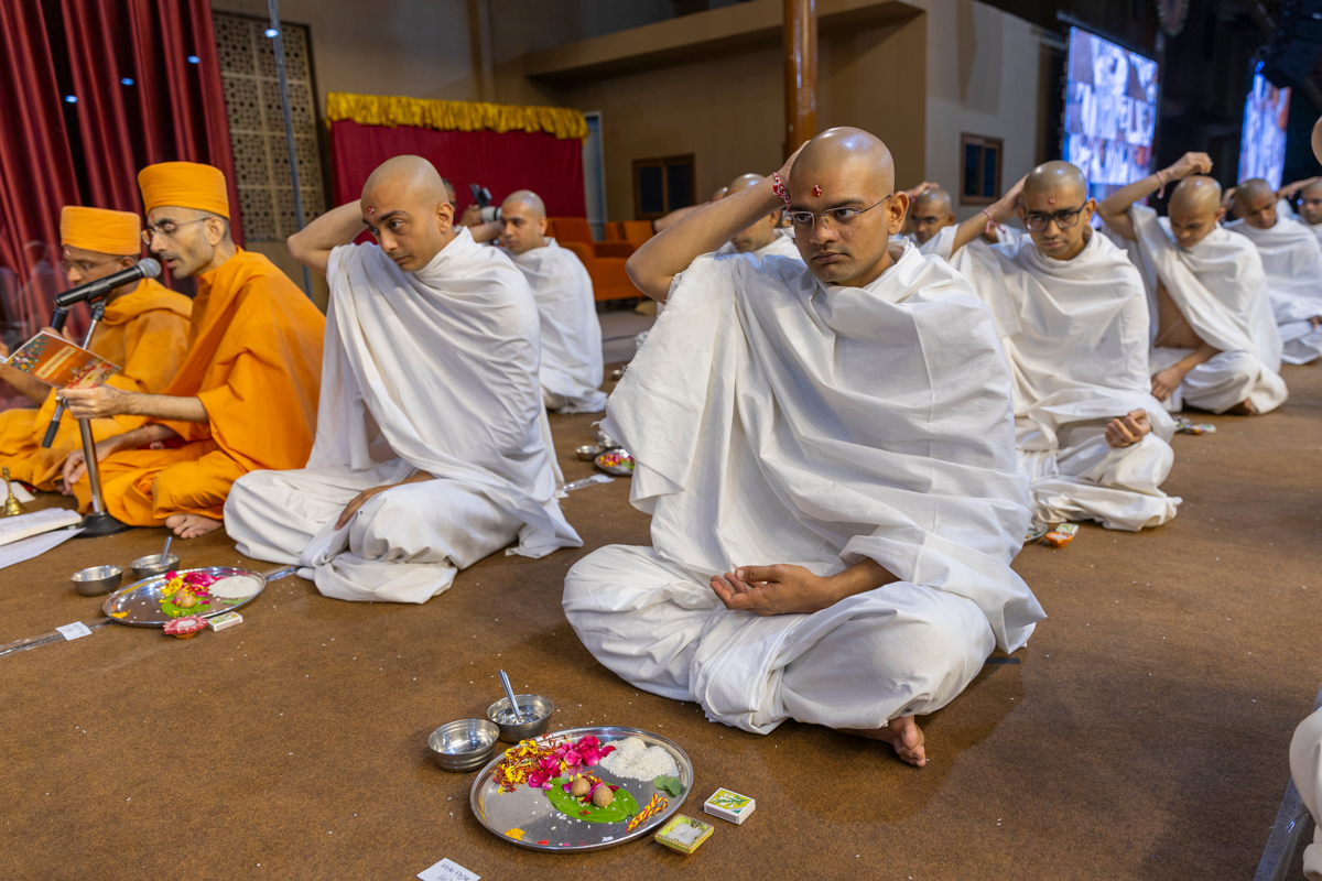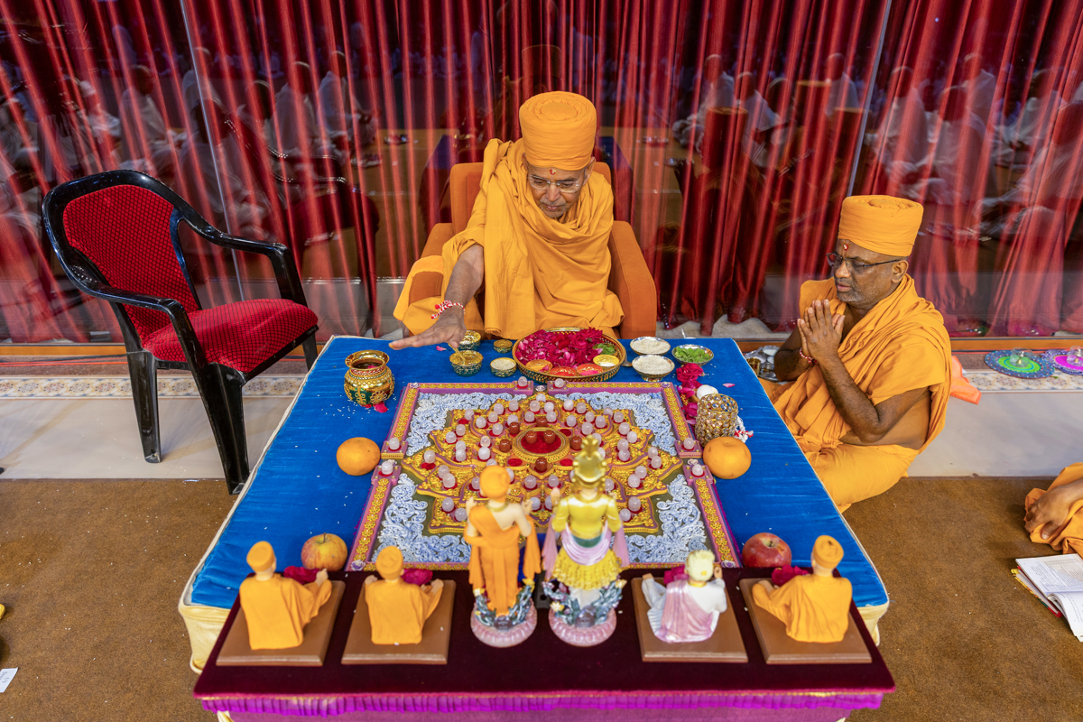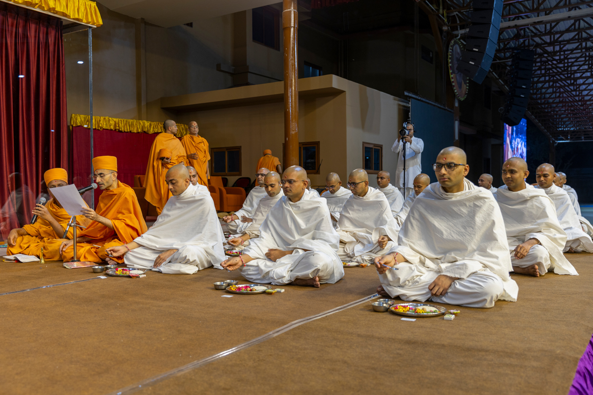Aksharcharan Swami and parshads perform the diksha mahapuja rituals