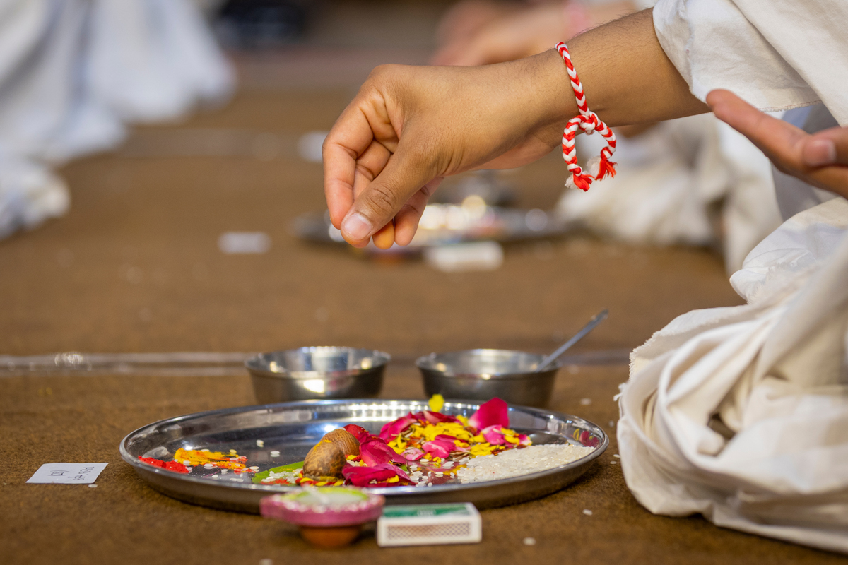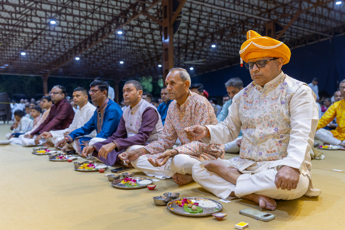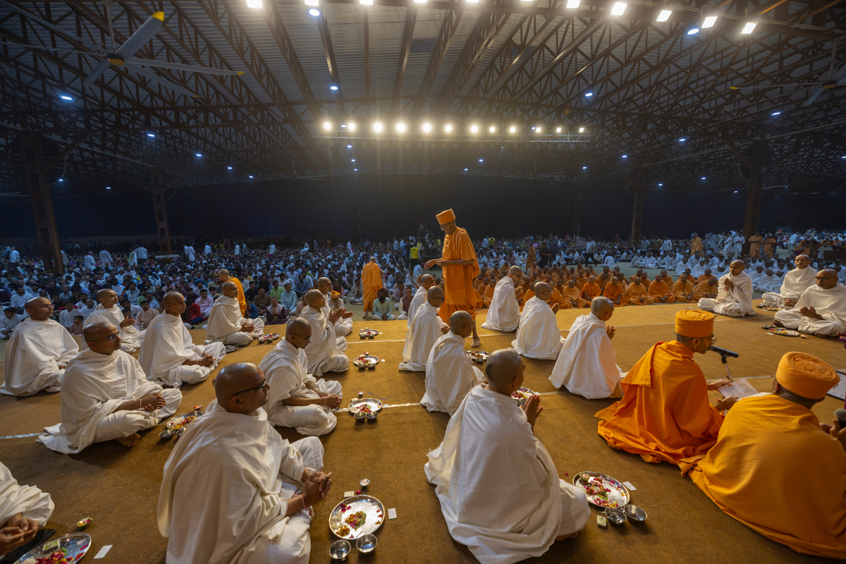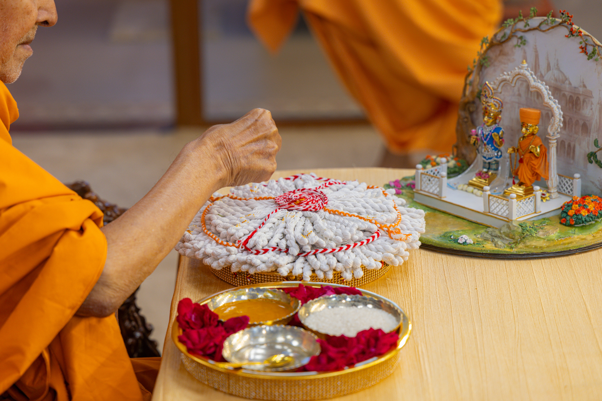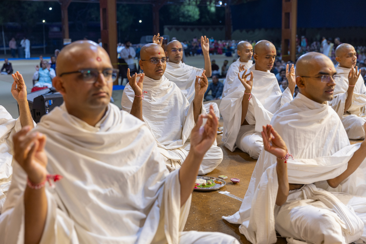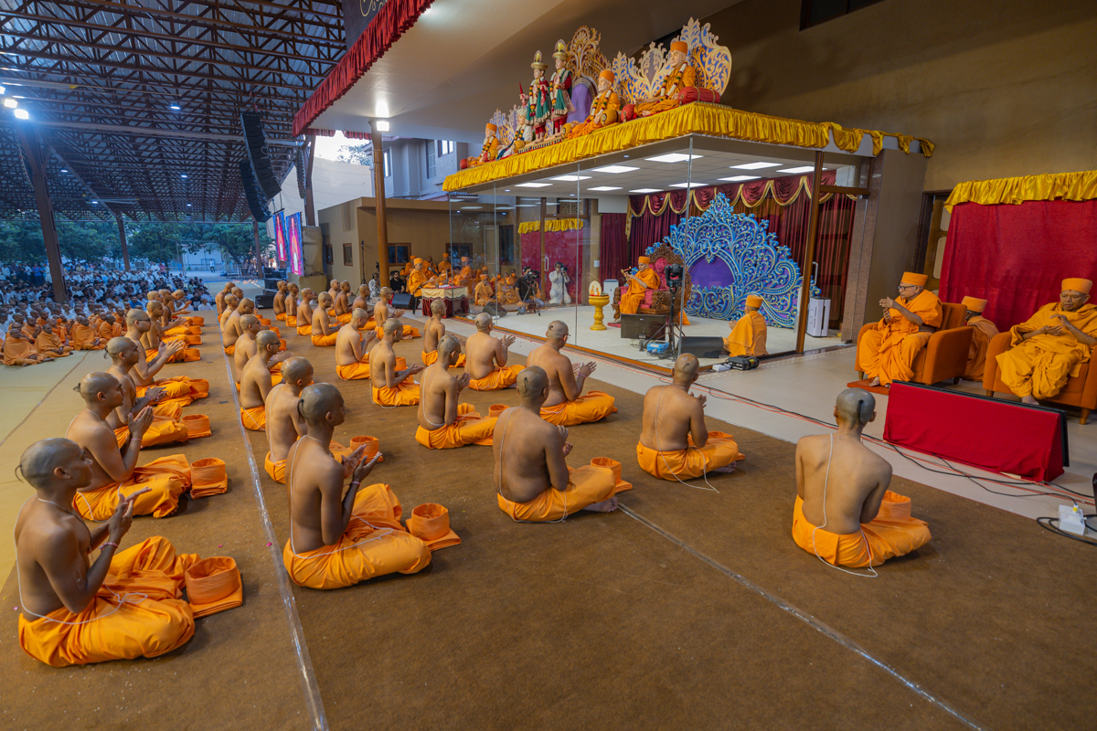 Aksharcharan Swami and parshads perform the diksha mahapuja rituals