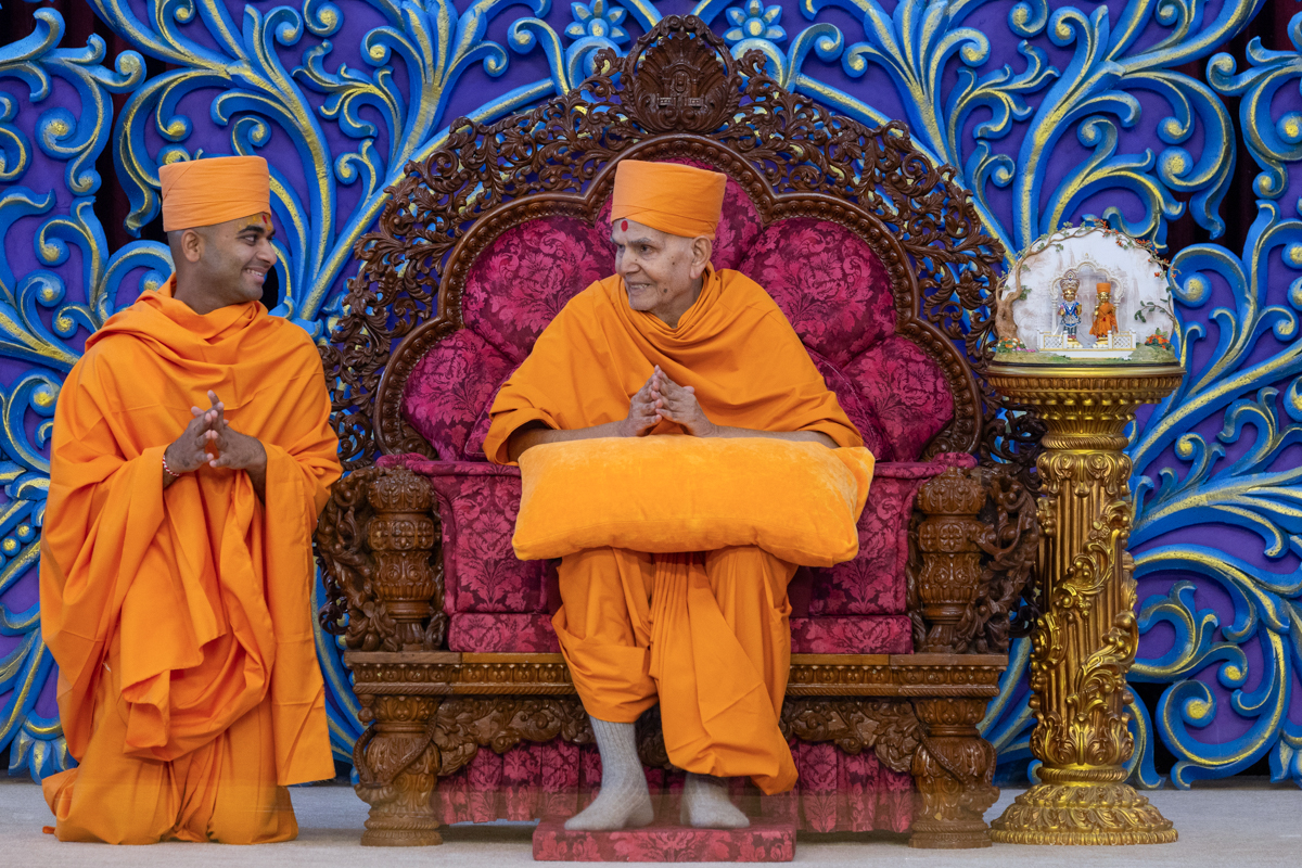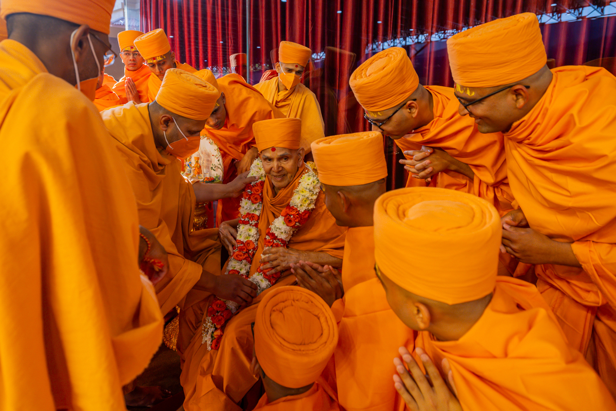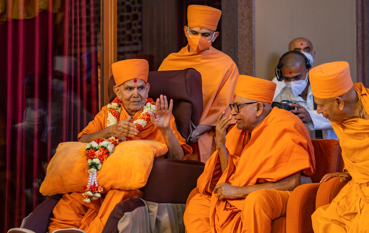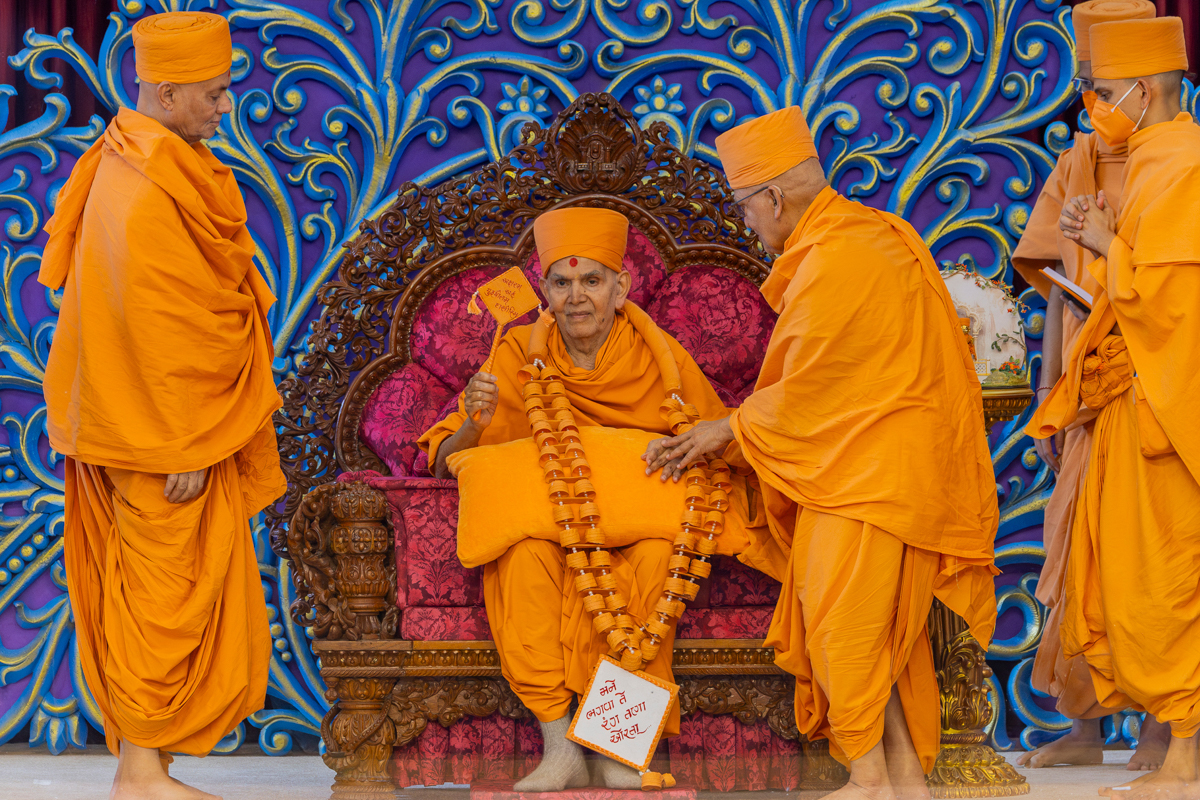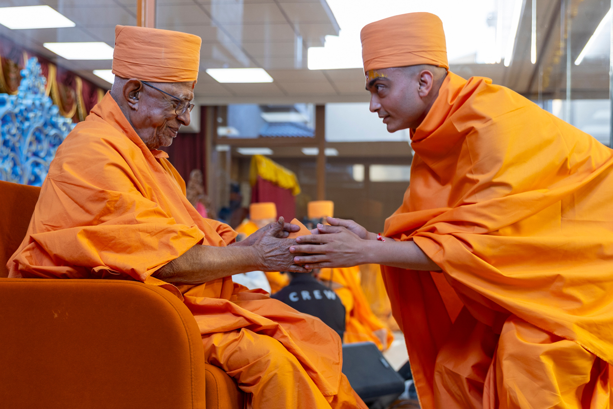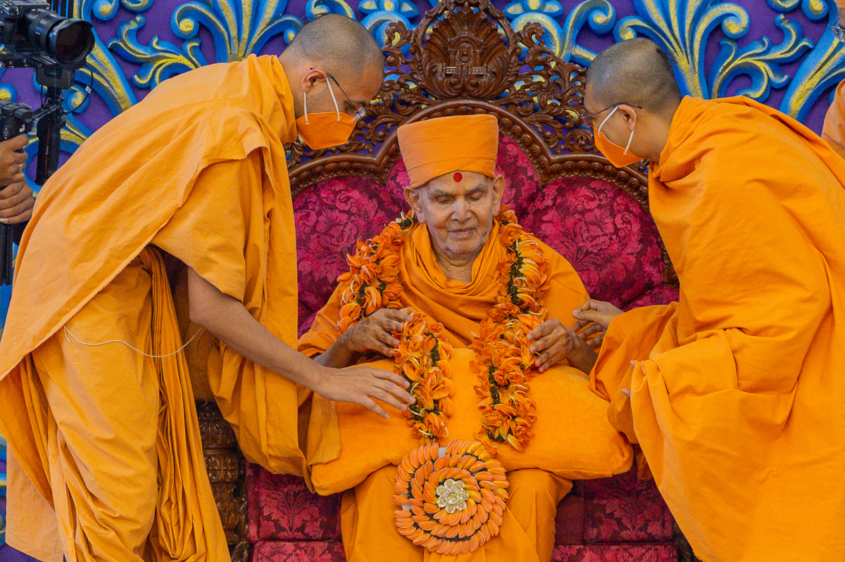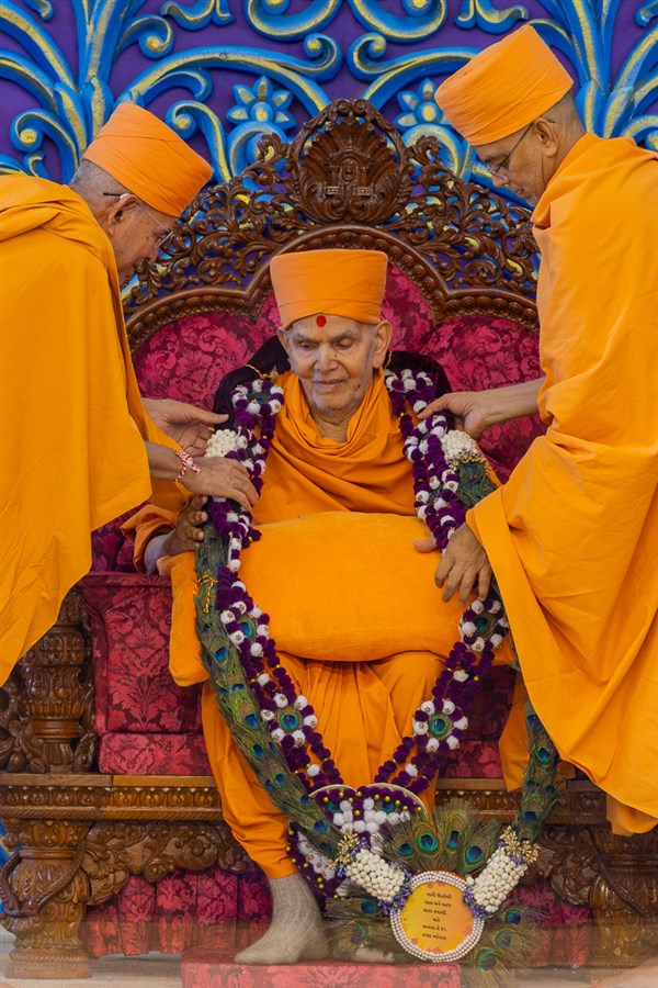 Narayanmuni Swami and Aksharcharan Swami honor Swamishri with a garland