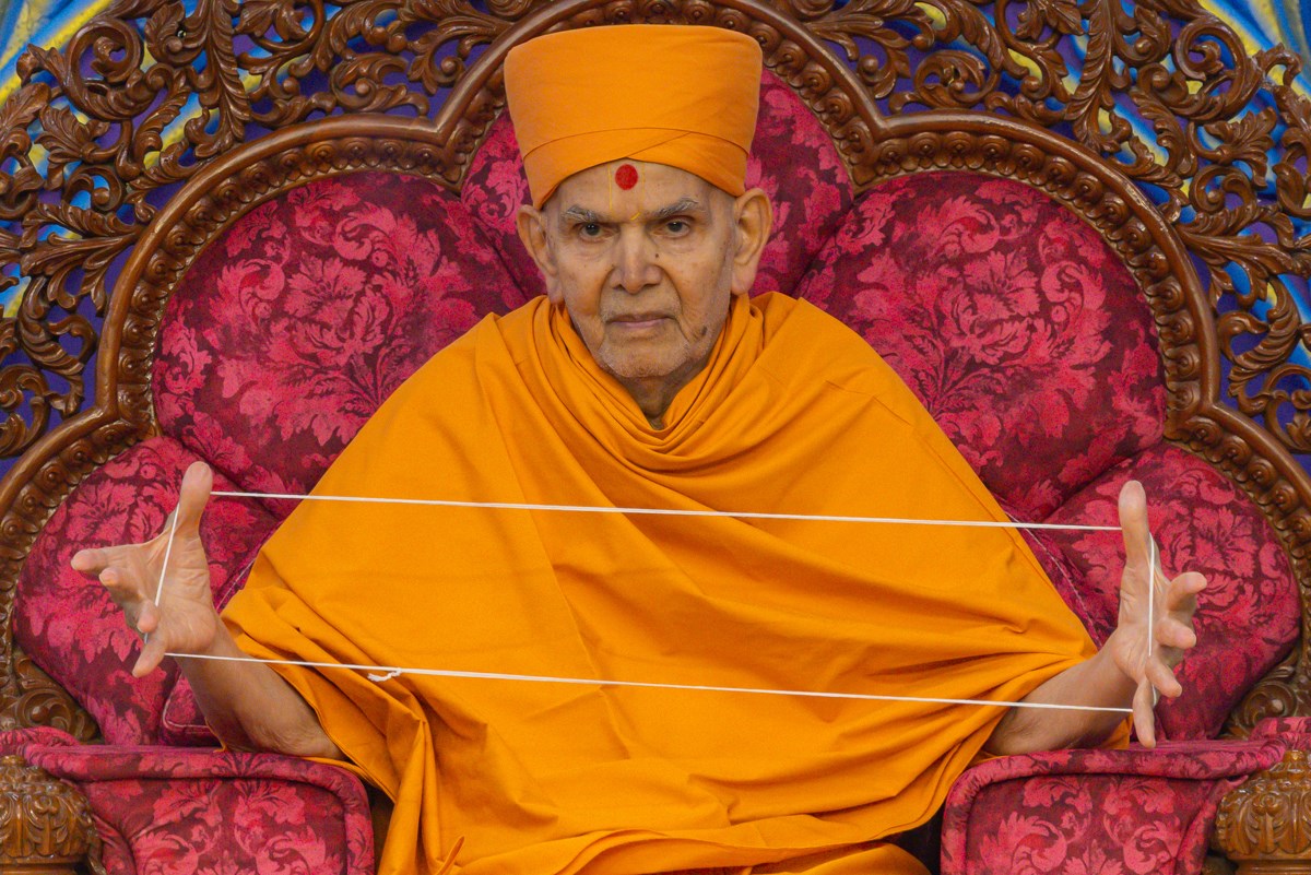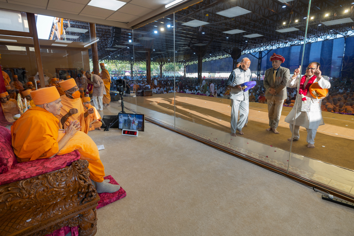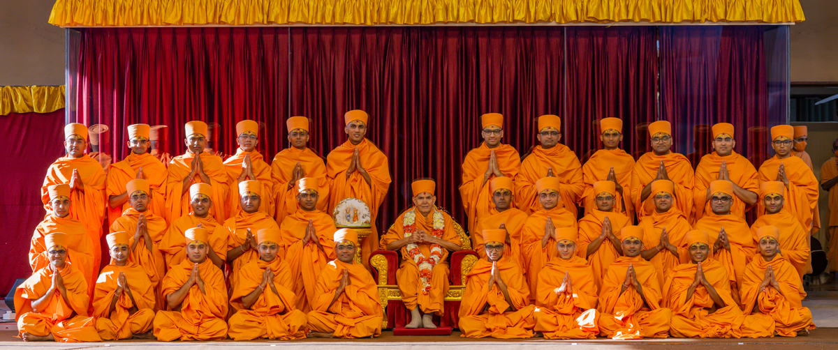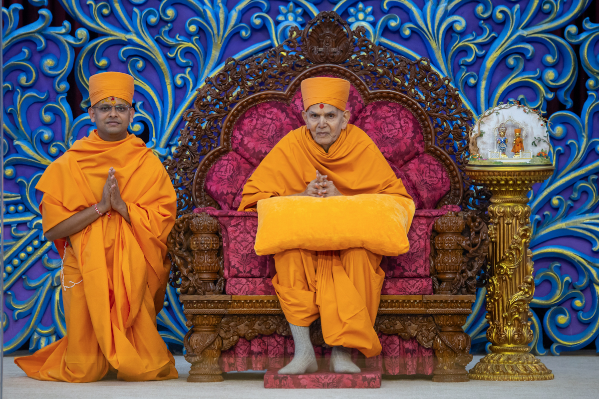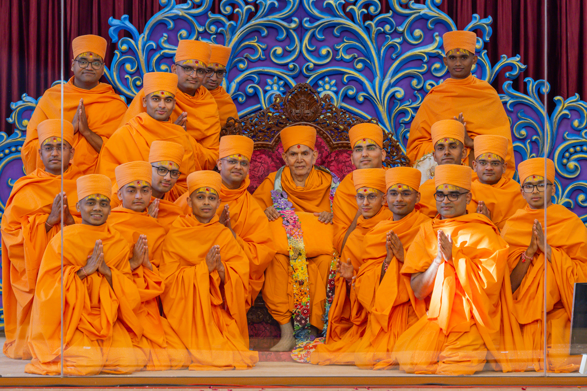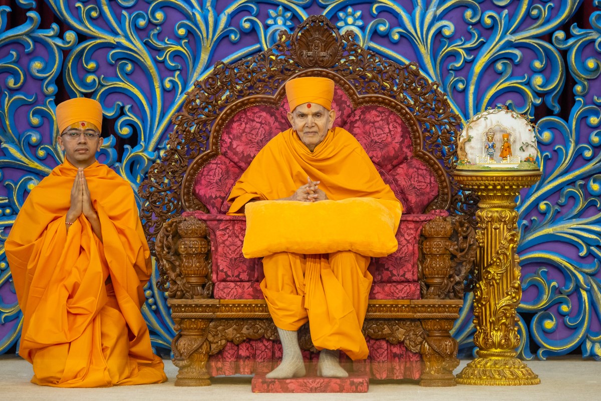 Narayanmuni Swami and Aksharcharan Swami honor Swamishri with a garland
