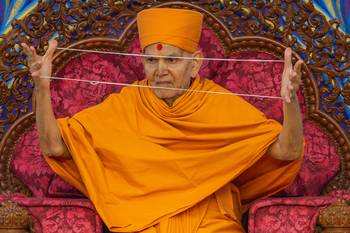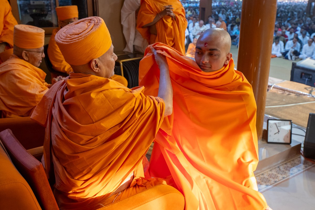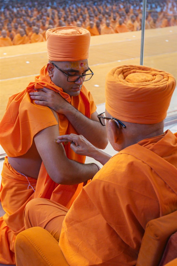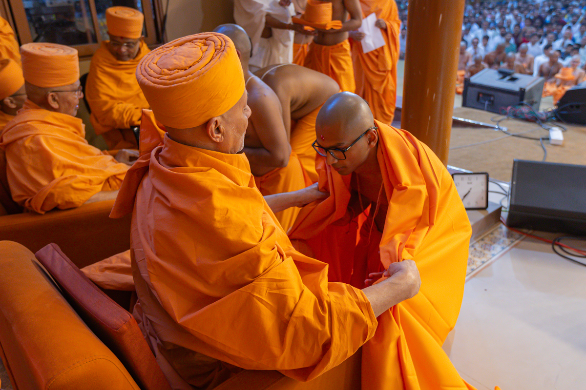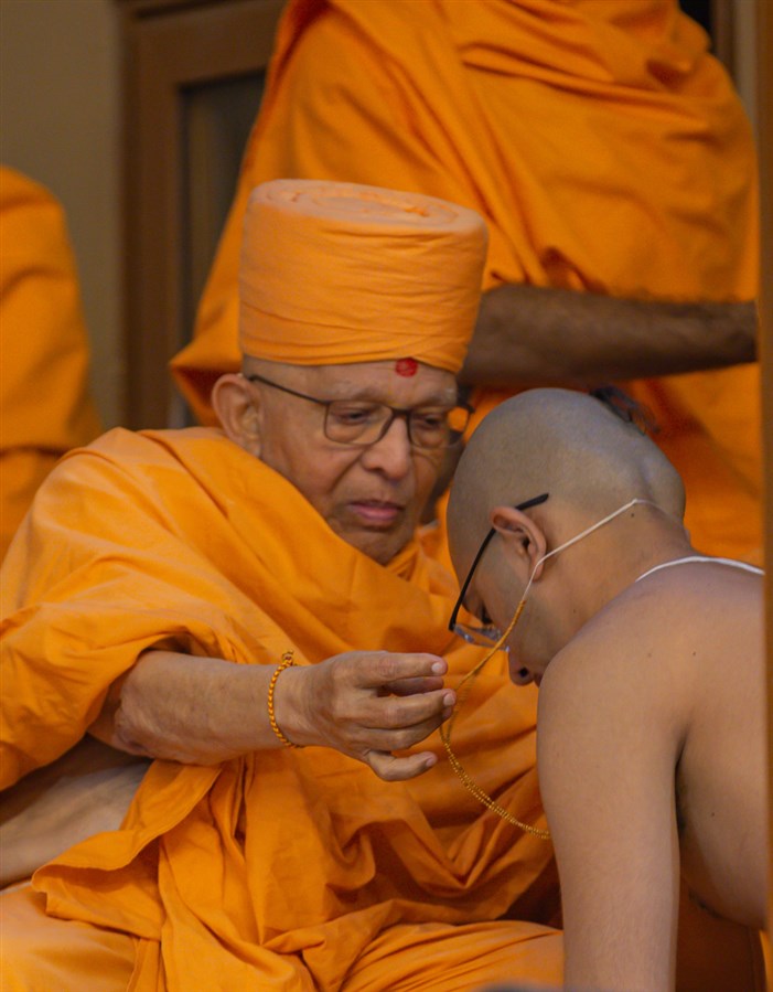 Pujya Ghanshyamcharan Swami gives a kanthi to a newly initiated swami