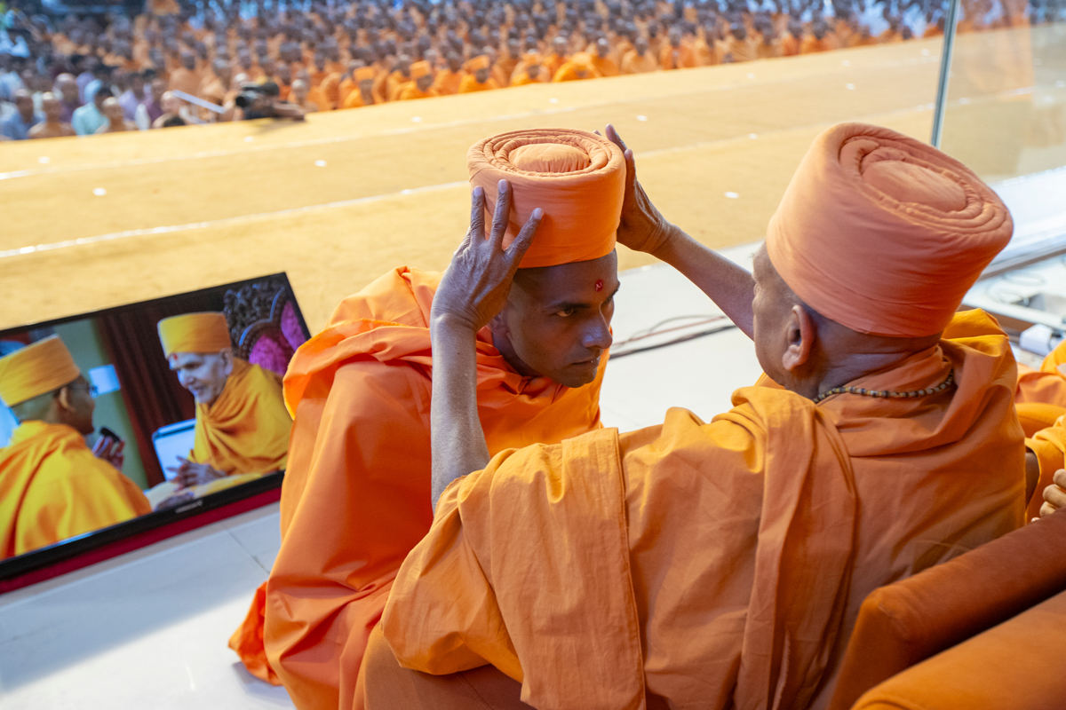 Pujya Tyagvallabh Swami places a pagh on a newly initiated swami