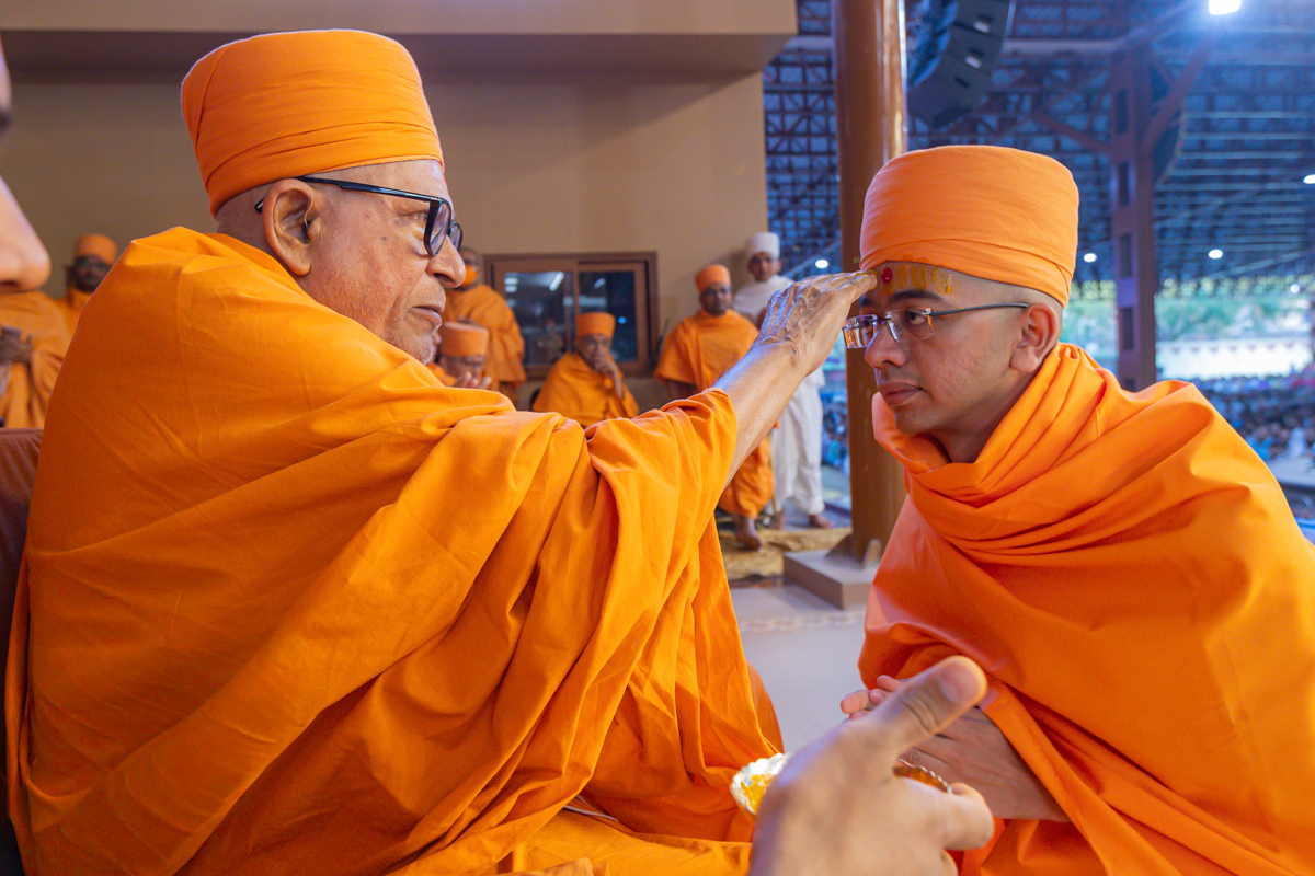 Pujya Kothari Swami applies a chandlo and chandan archa to a newly initiated swami