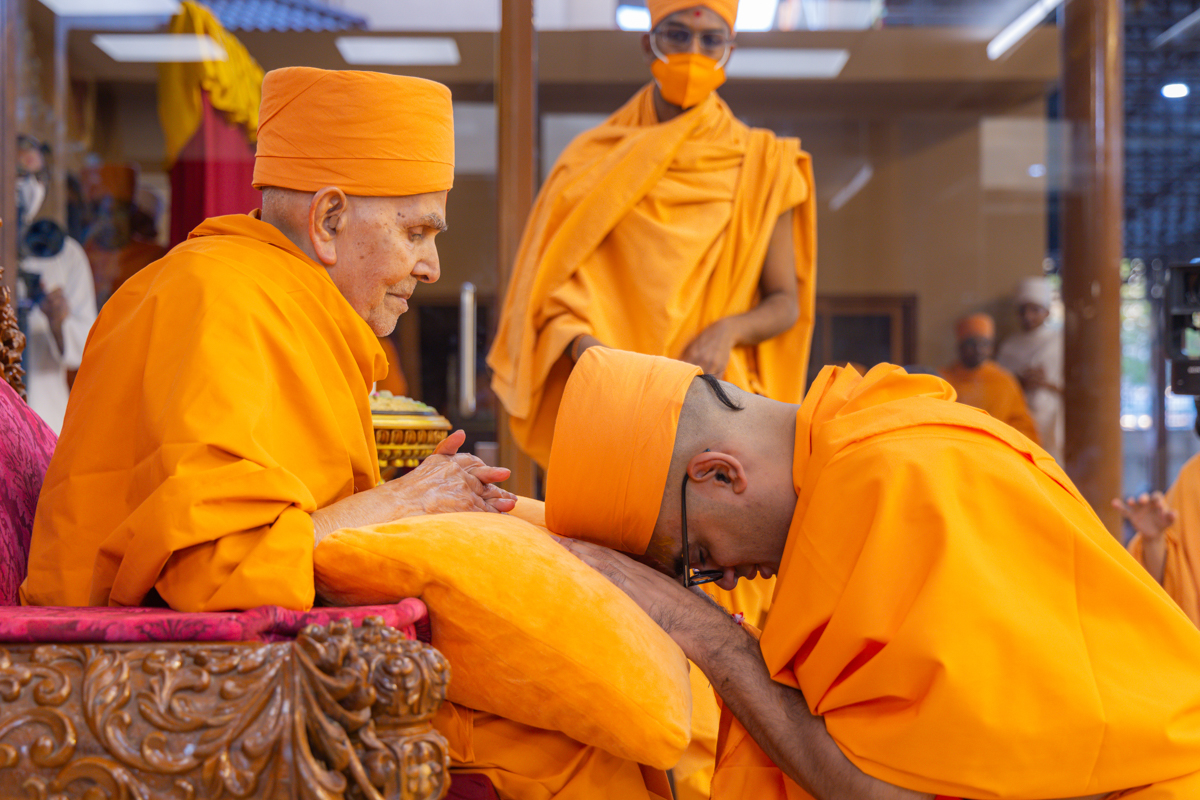 A newly initiated swami doing darshan of Pujya Swayamprakash Swami (Doctor Swami)