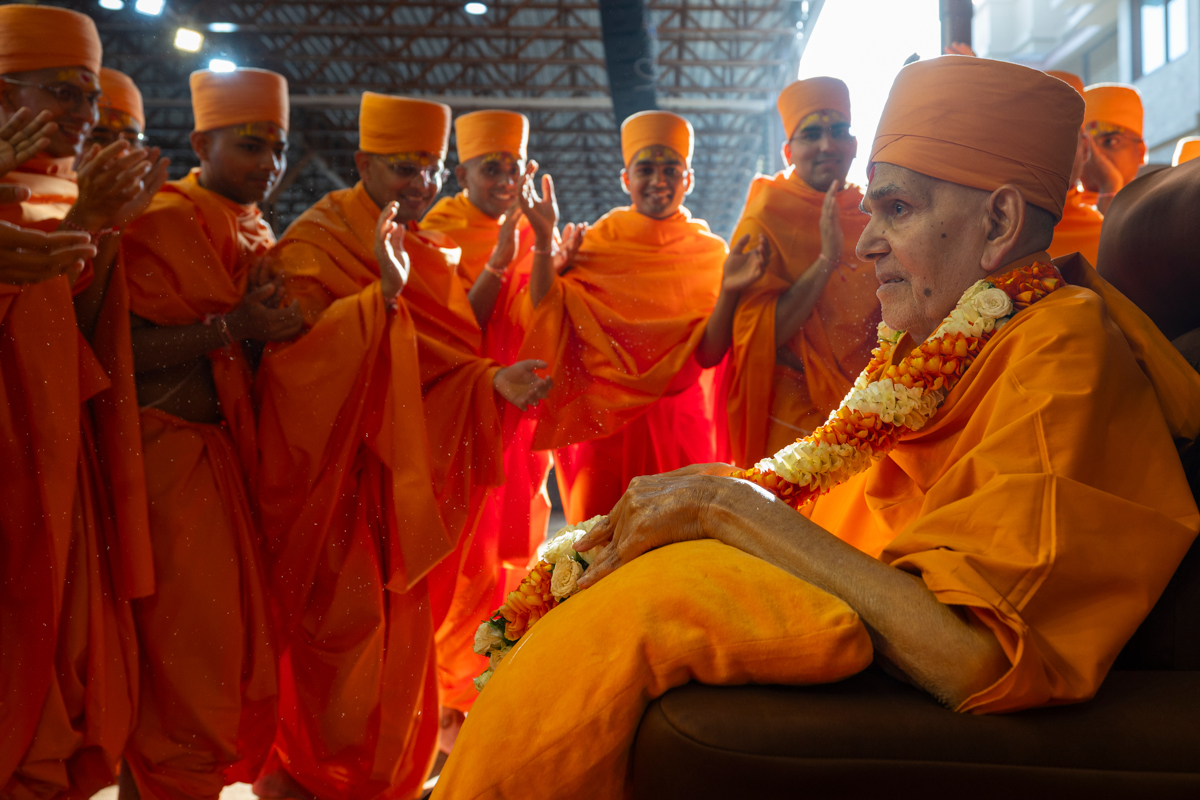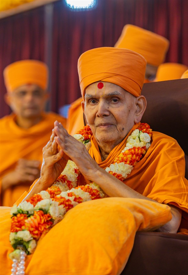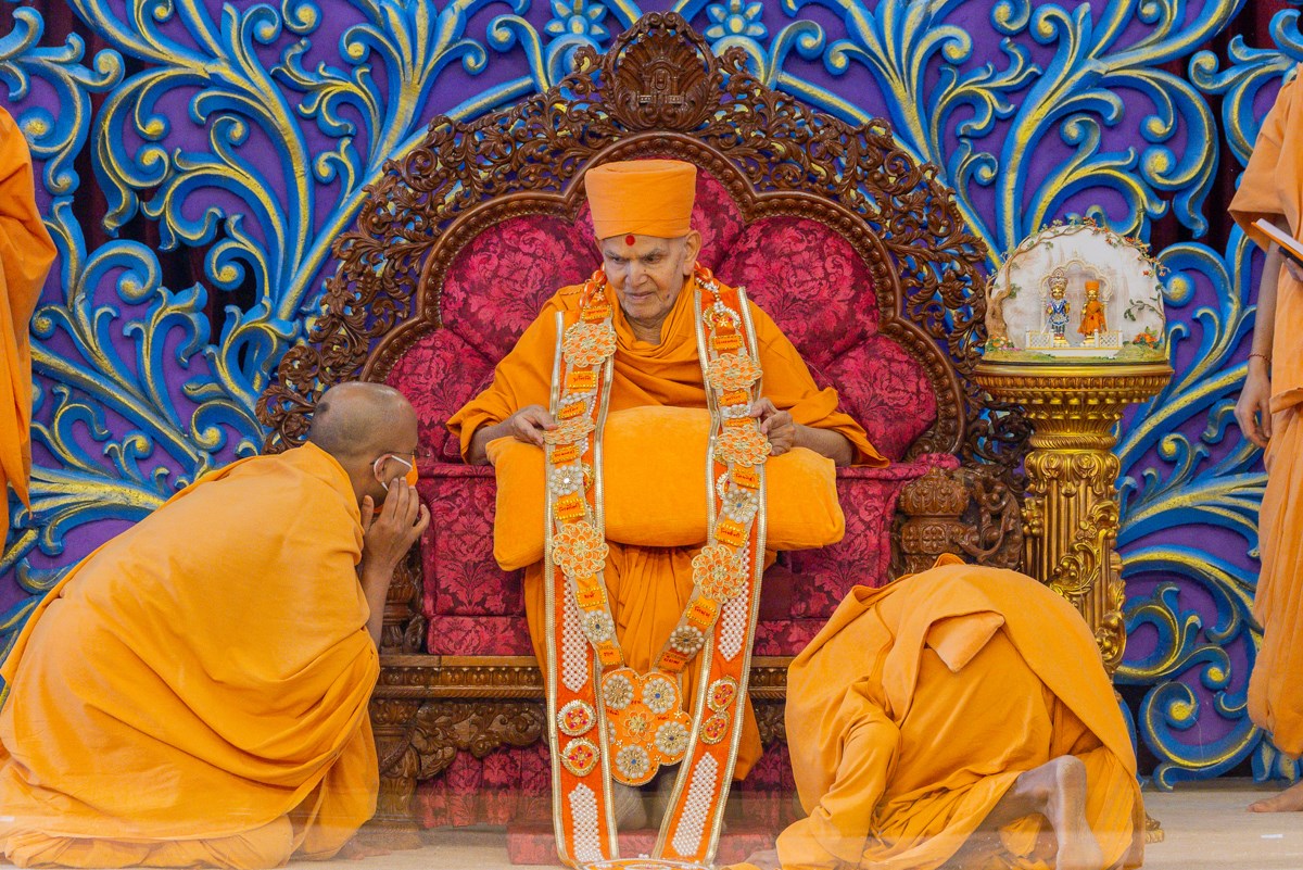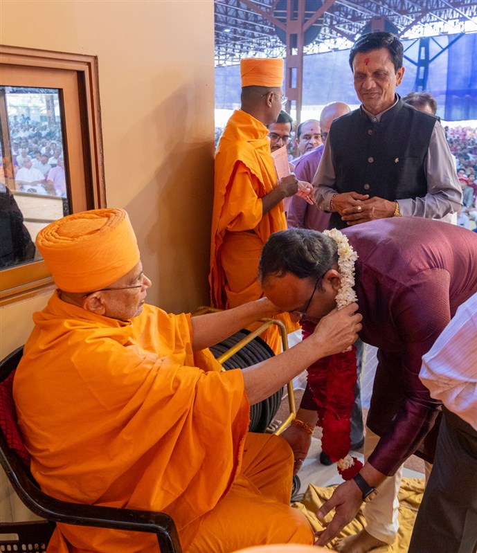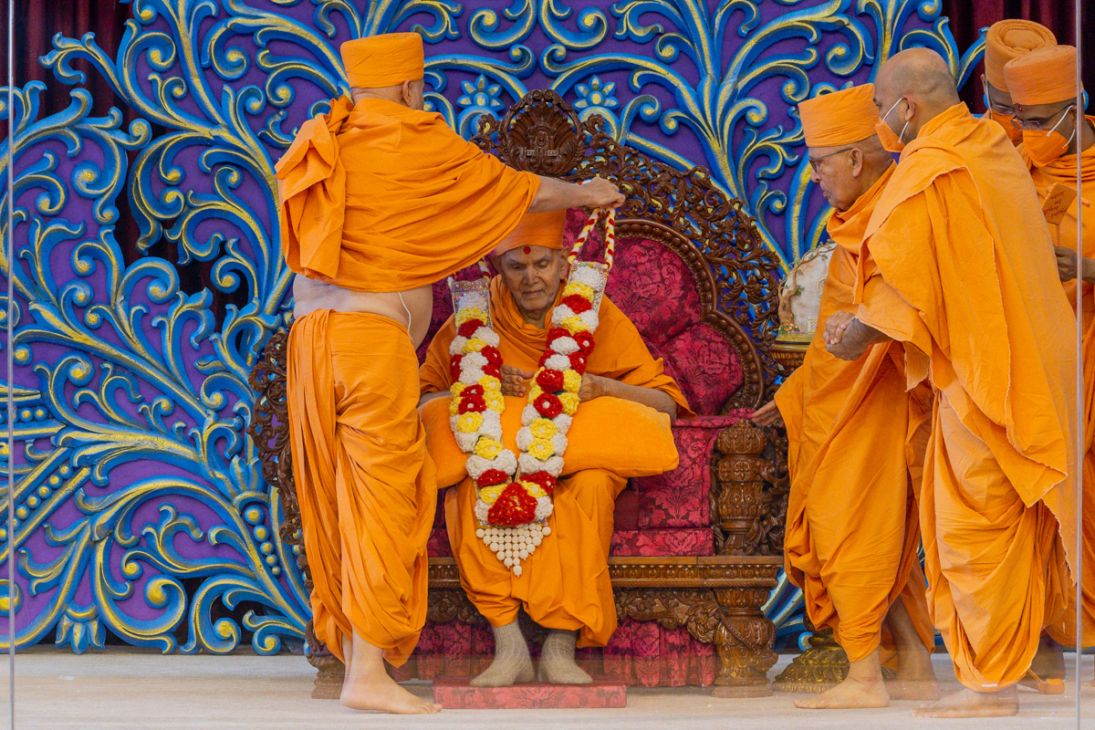 Pujya Ghanshyamcharan Swami honors Swamishri with a garland