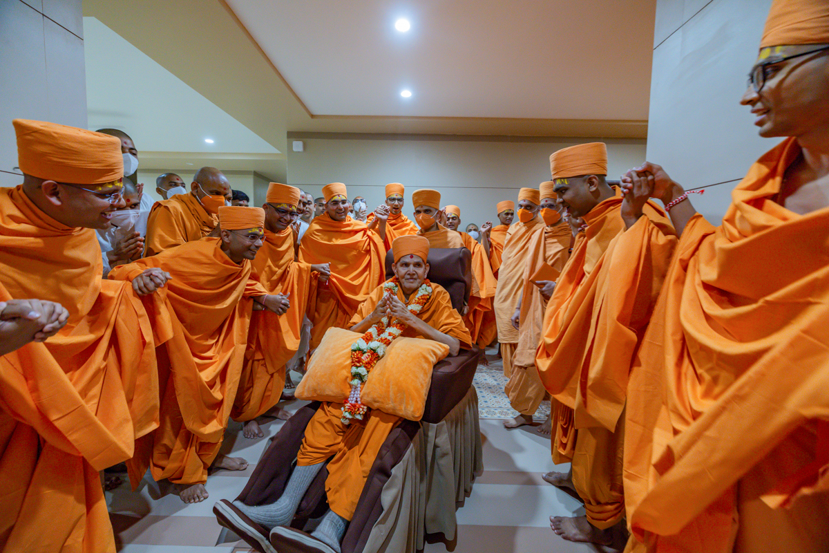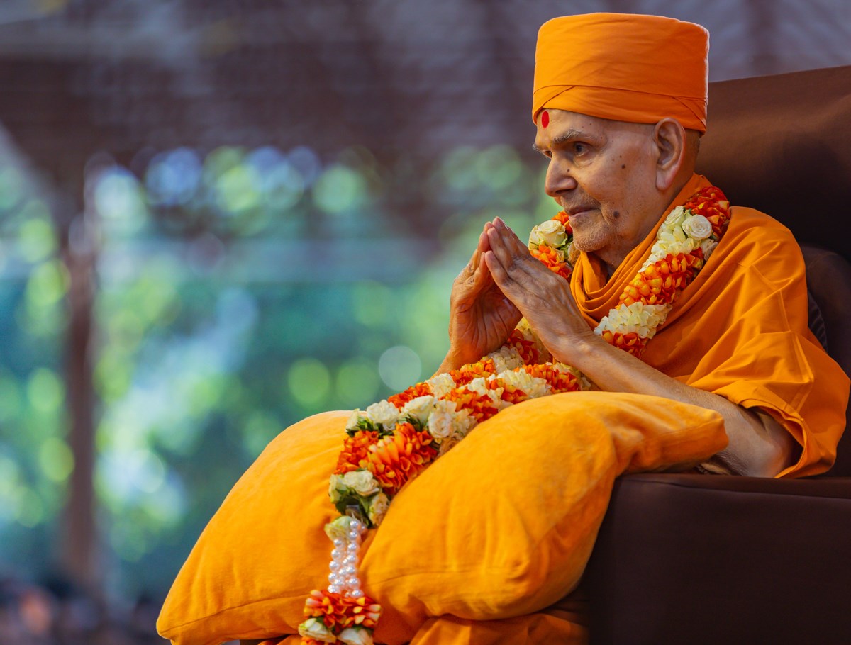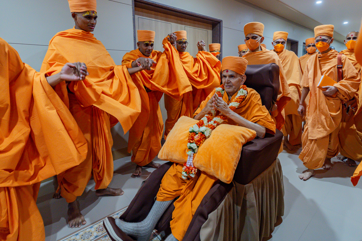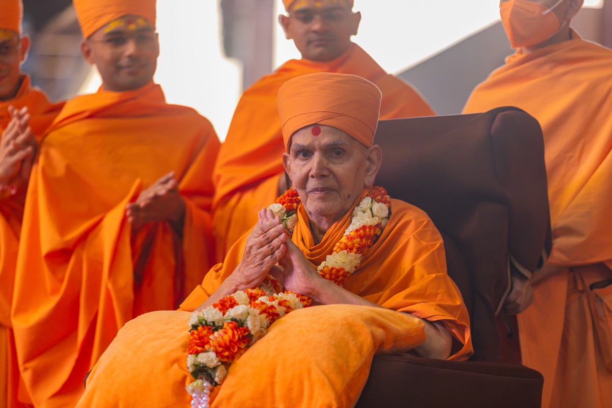 Pujya Ghanshyamcharan Swami honors Swamishri with a garland