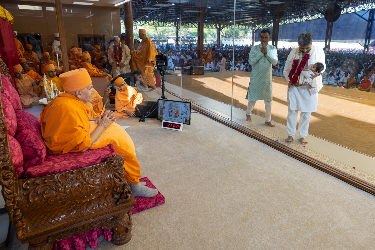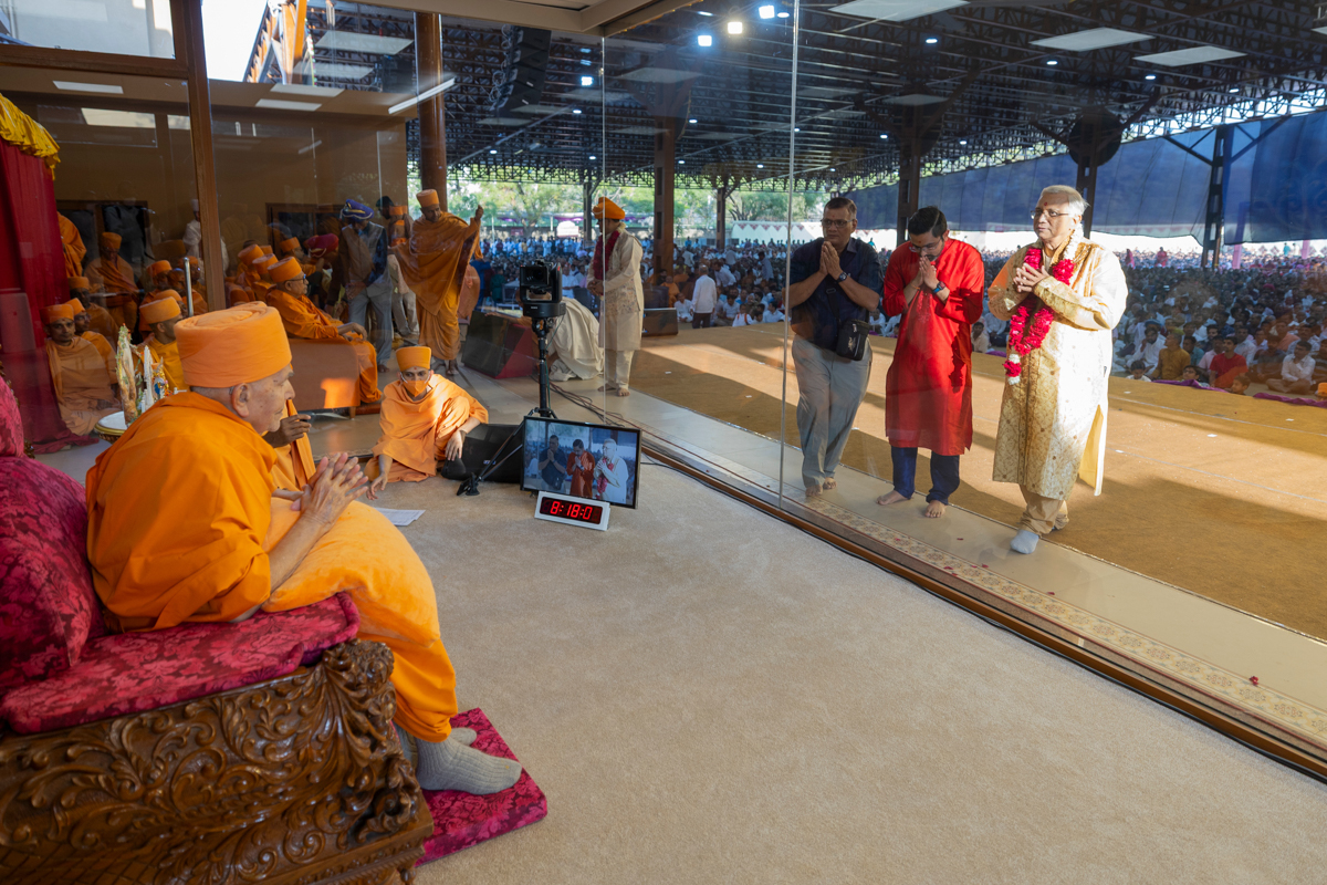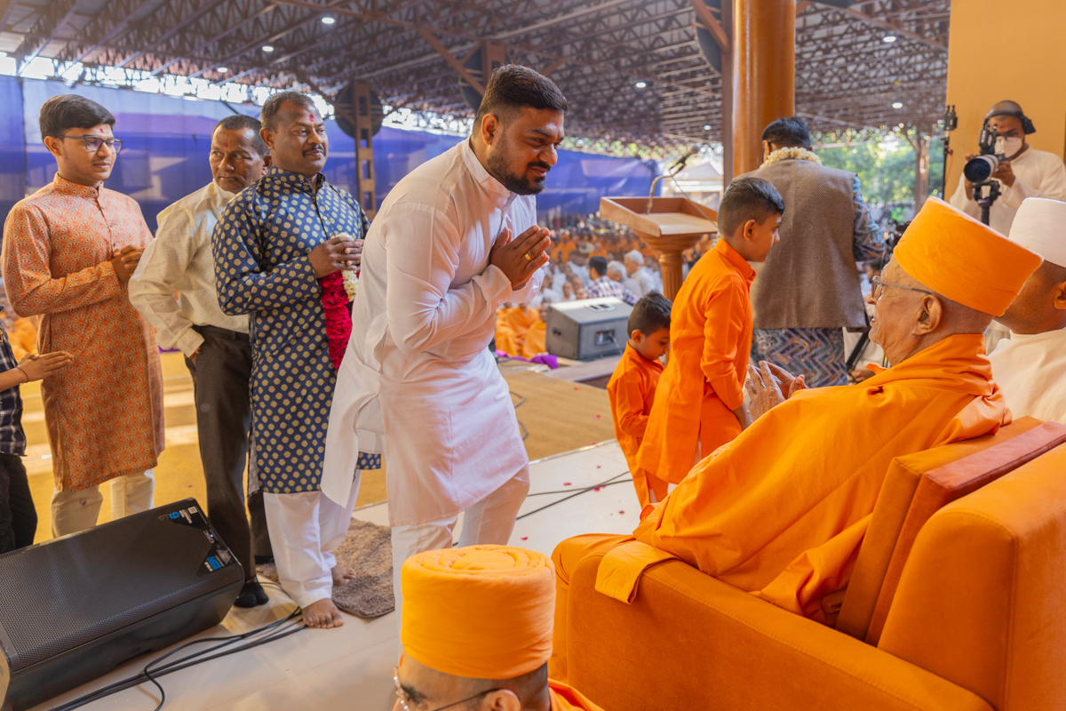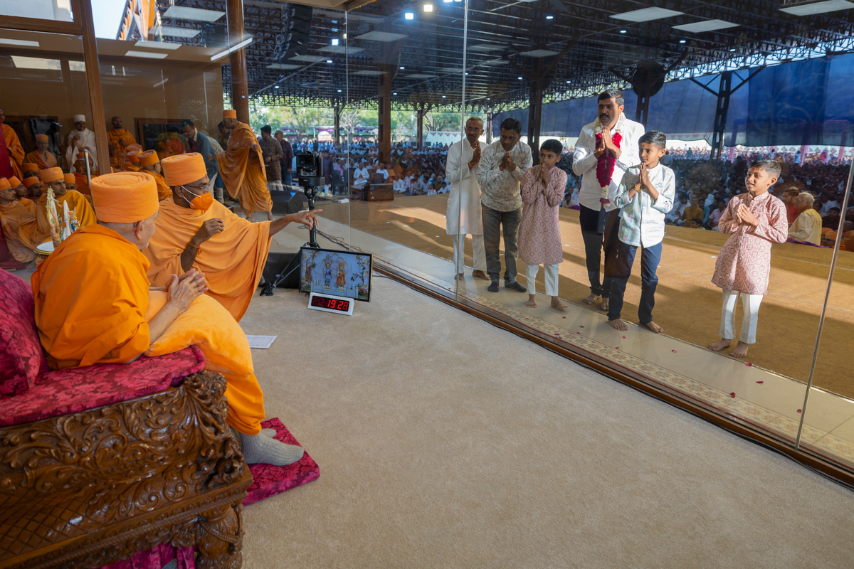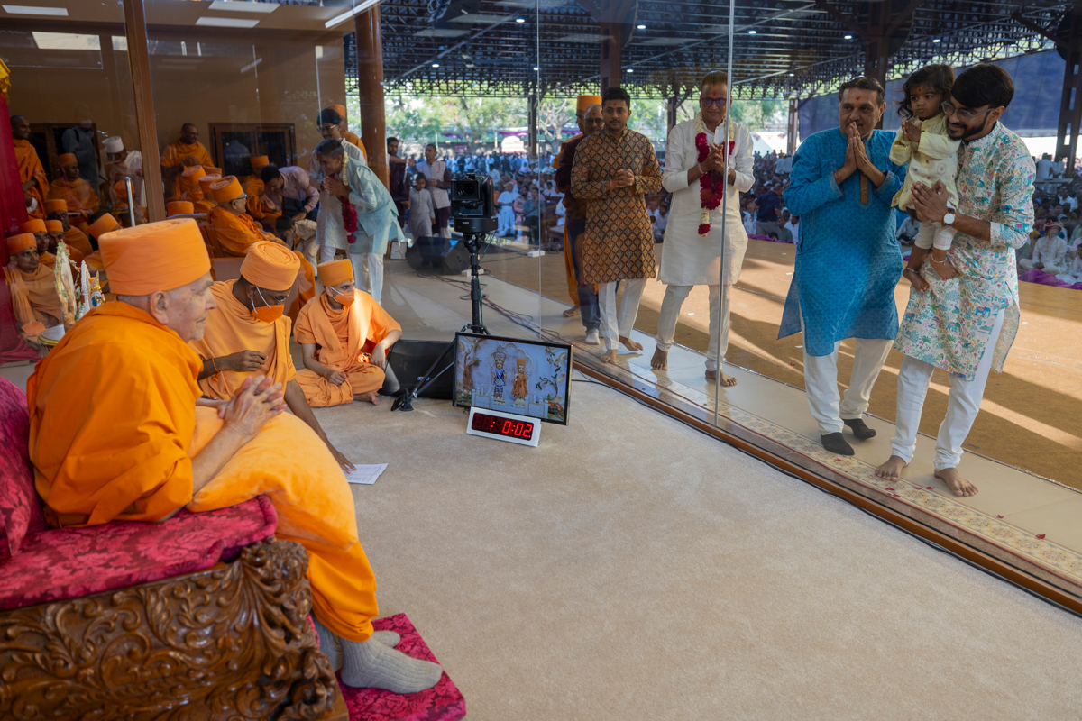 A newly initiated swami's relatives doing darshan of Pujya Doctor Swami