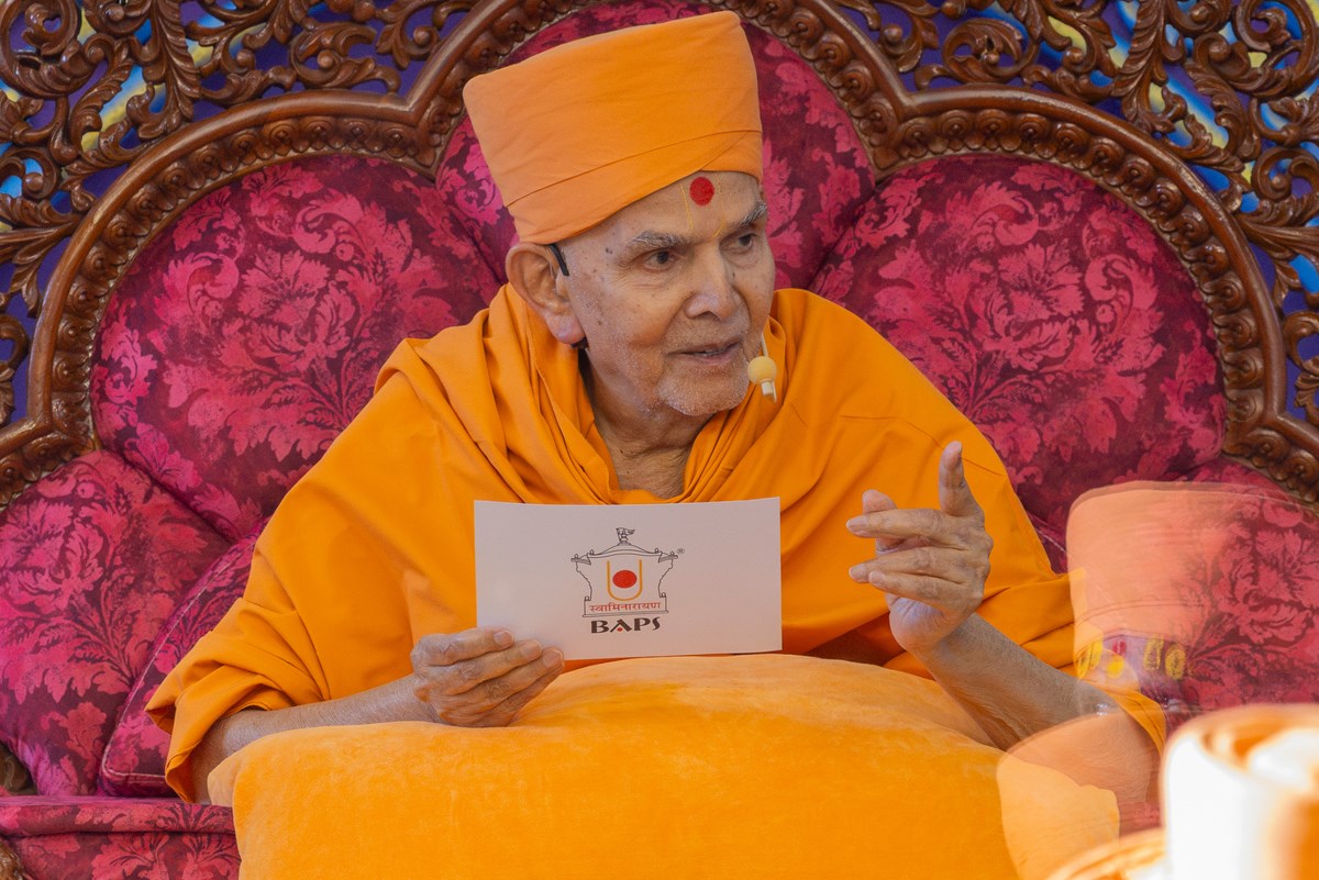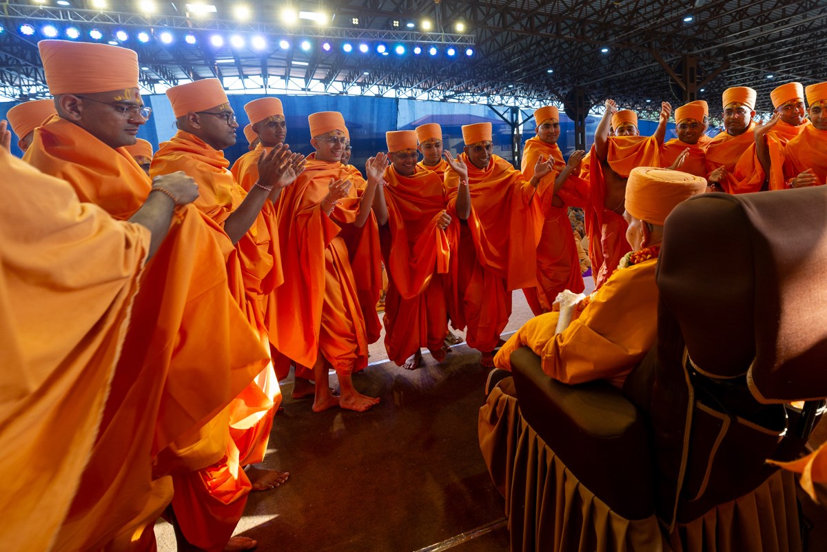 Pujya Viveksagar Swami honors Swamishri with a garland