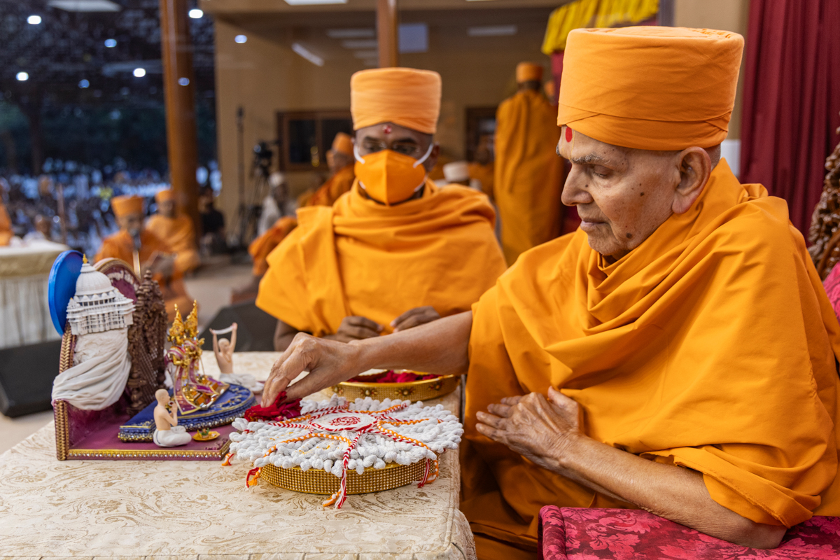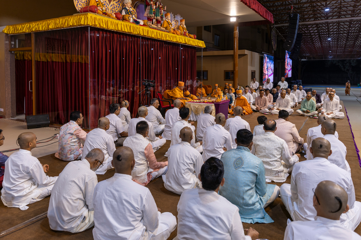 Swamishri and parshads perform the diksha rituals