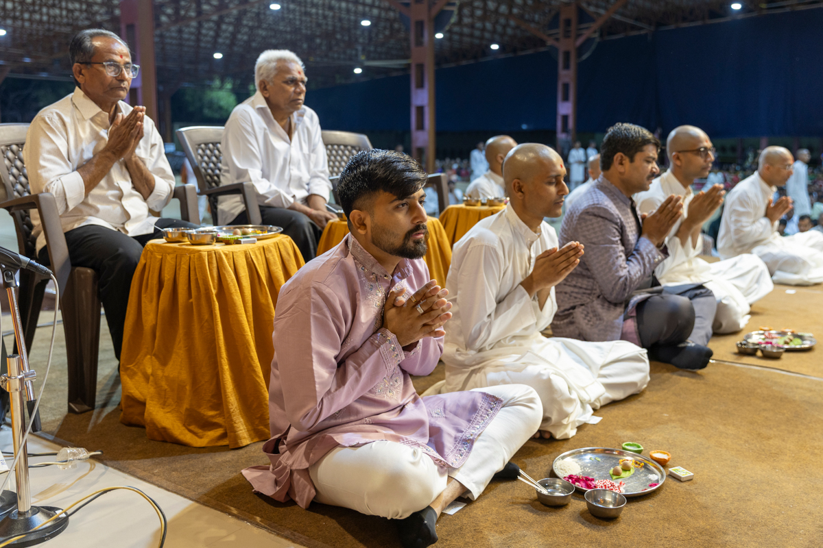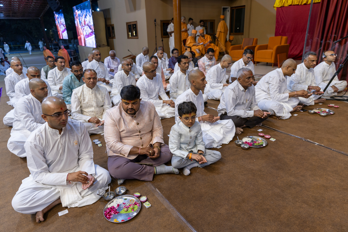 Aksharcharan Swami, sadhaks and their relatives perform the diksha mahapuja rituals