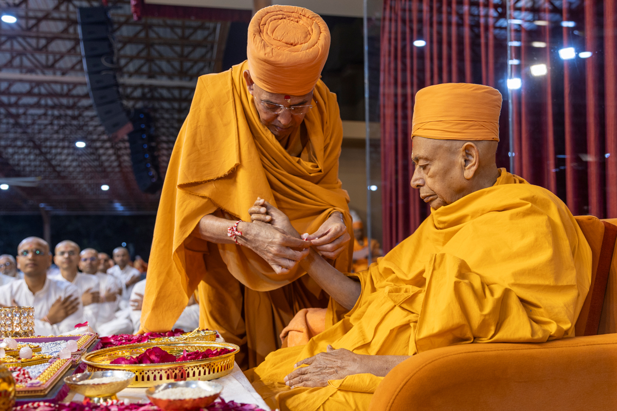 Aksharcharan Swami ties a nadachhadi to Pujya Tyagvallabh Swami