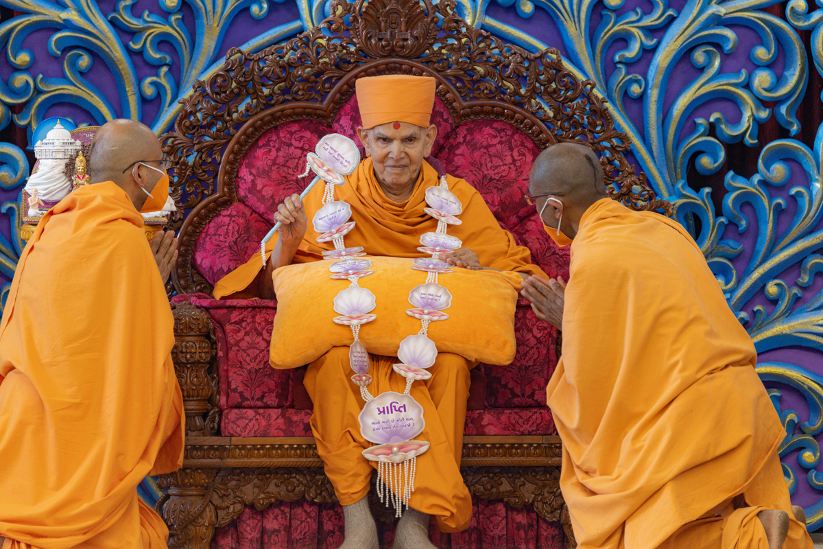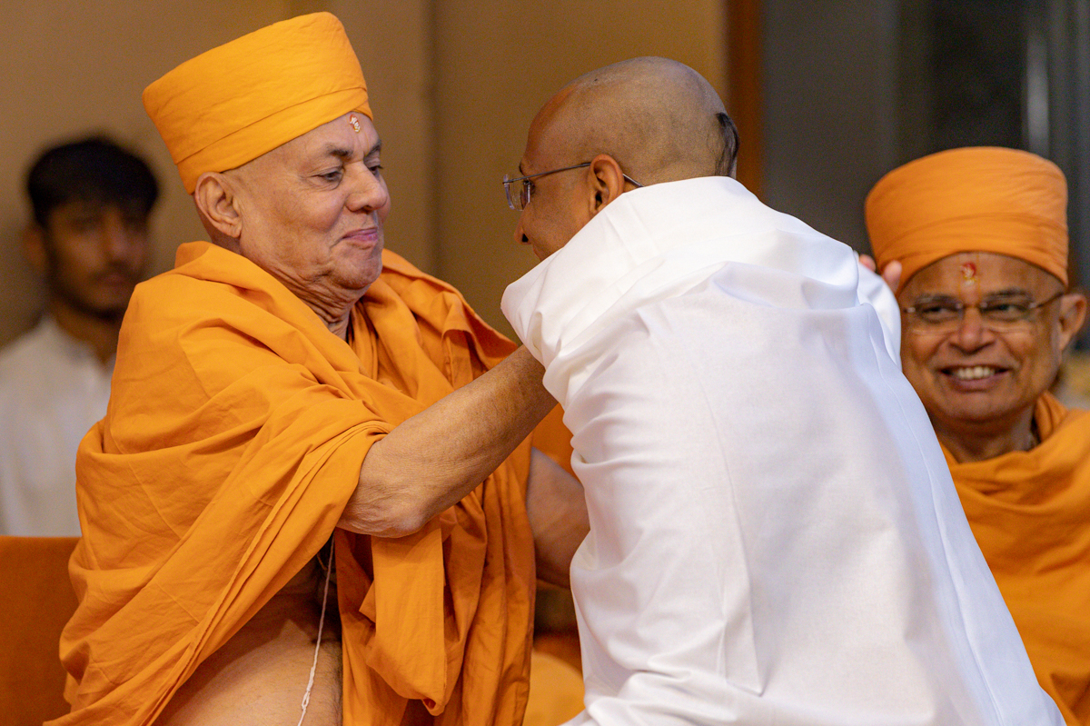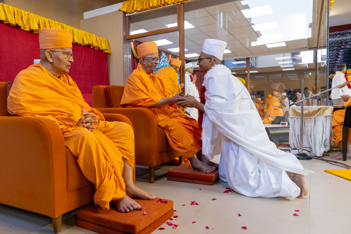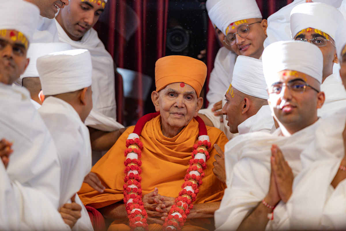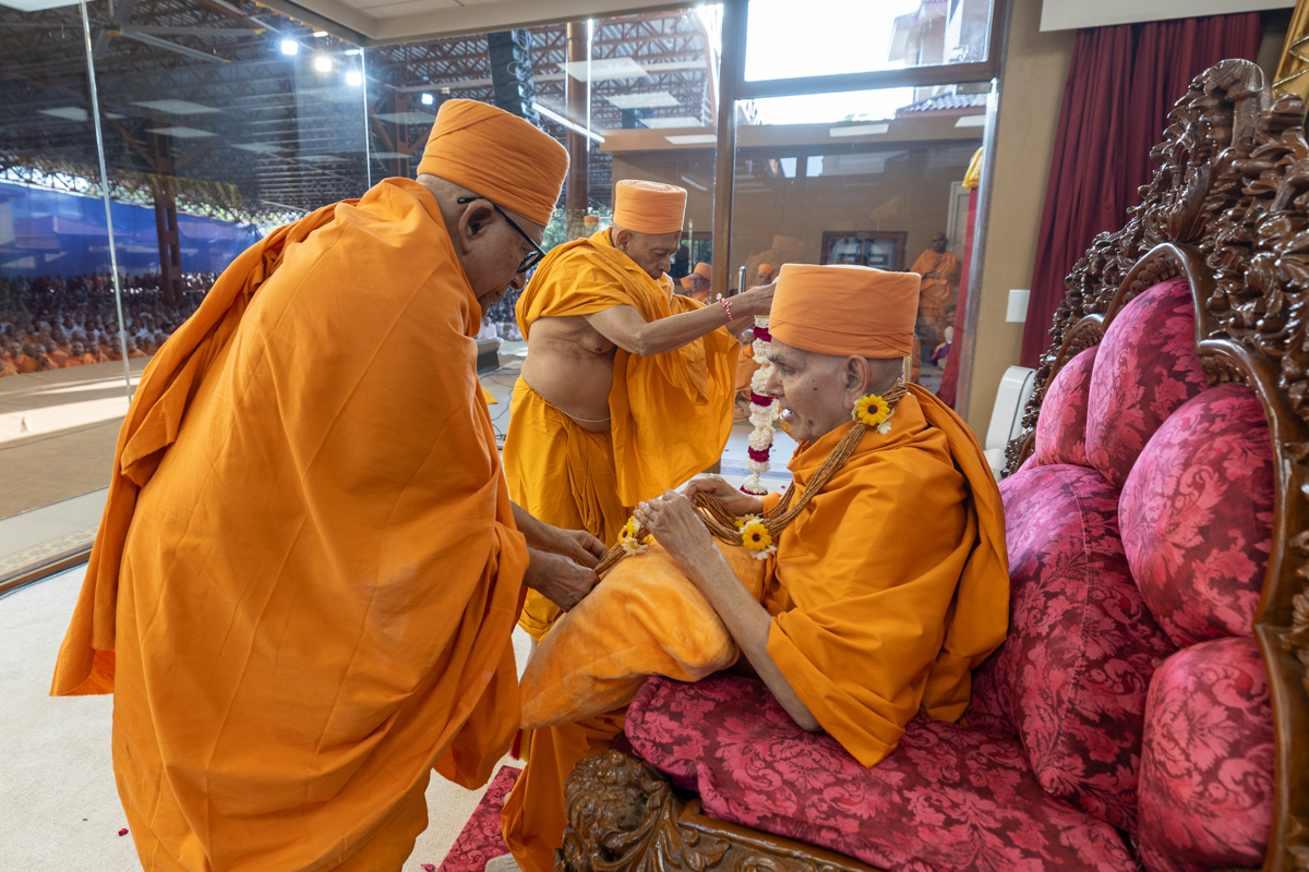 Pujya Kothari Swami honors Swamishri with a garland